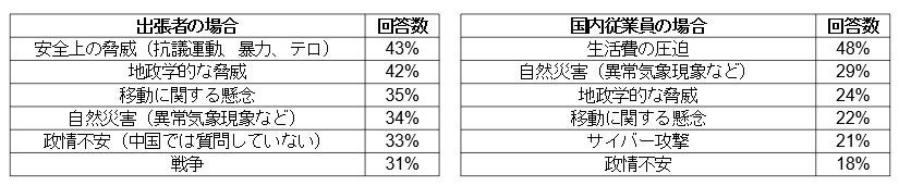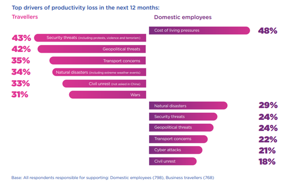 この調査では、2023年の社会不安の増大がさらなる生産性低下の主要因になるだろうと多くの専門家が予想していることも示しています。たとえば、専門家の48%は物価圧力が国内の被雇用者に影響をおよぼすと予想し、33%は市民社会の不安がビジネス上の渡航者に影響を与えると考えています。