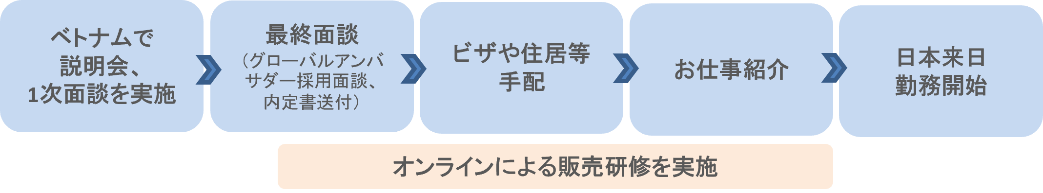 またグローバルアンバサダーとして就労するベトナム人には、日本人販売員と同等レベルの雇用条件を提供し、育成された人材として就業先で活躍していただきます。