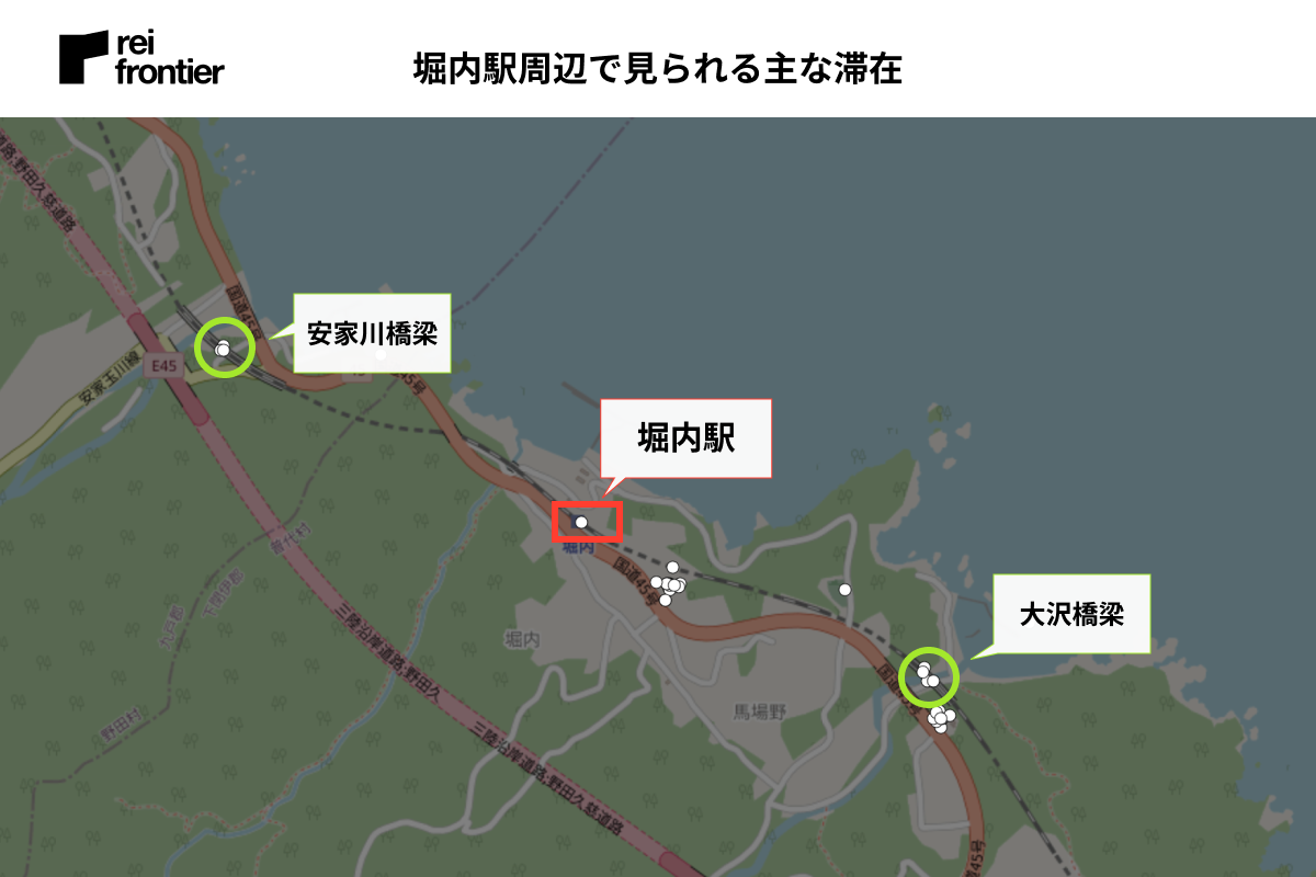 ・大沢橋梁と安家川橋梁の停車スポットで滞在が見られた