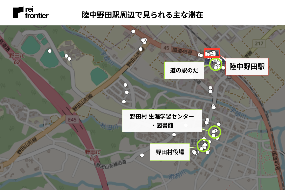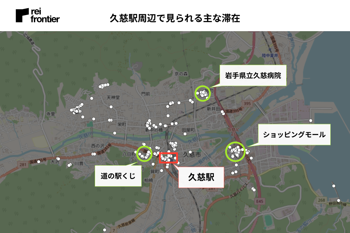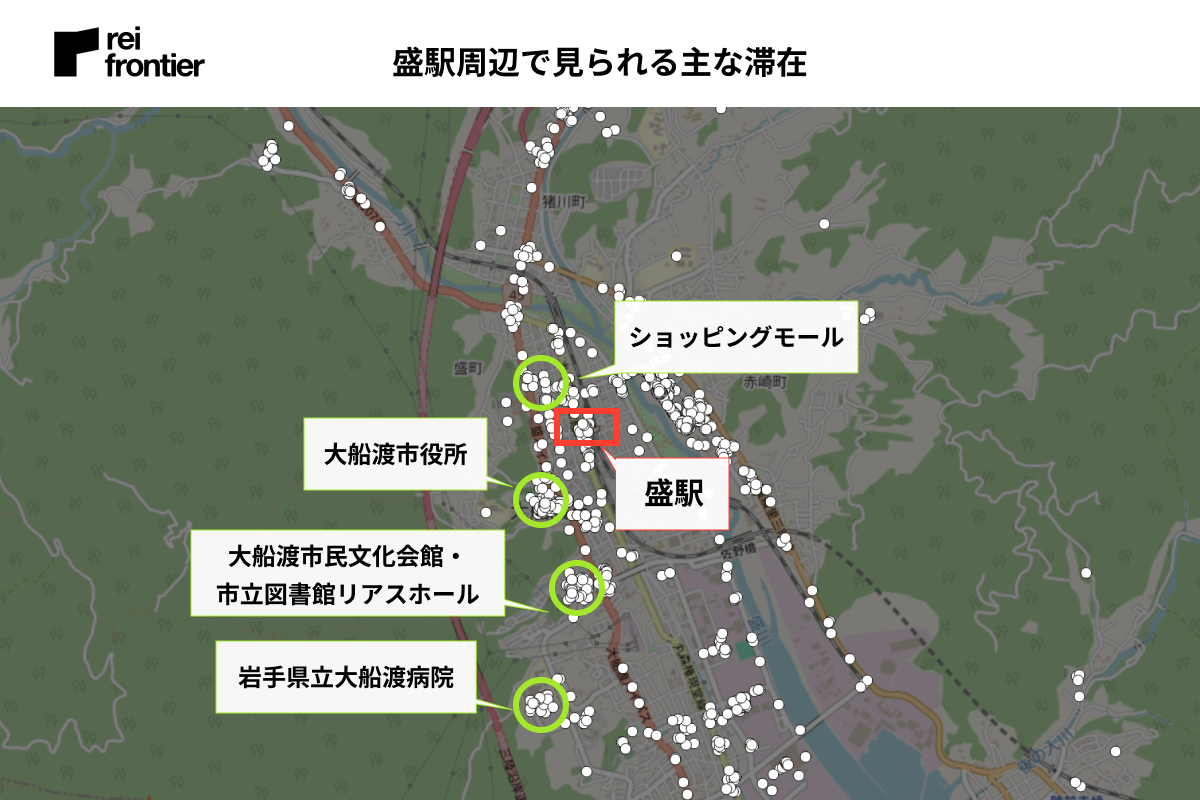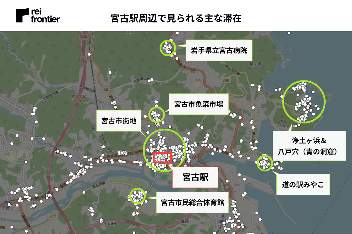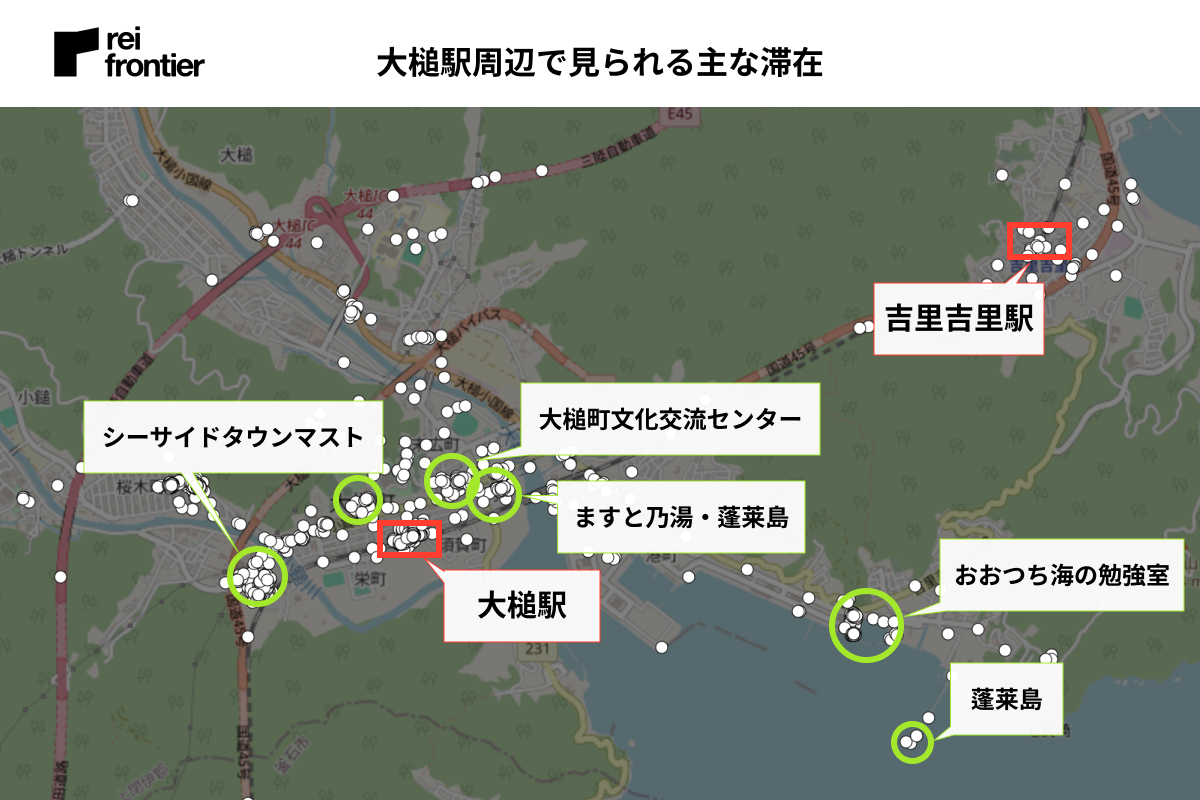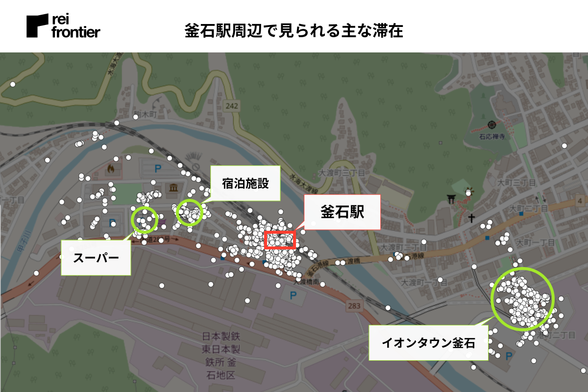 『JR釜石線』の乗り換えに利用する駅のため、他の駅と比べ駅周辺での滞在が多く見られました。商業施設や宿泊施設もありますが、駅から離れたところにある「イオンタウン釜石」「釜石市民ホールTETTO」など大きい施設周辺でも滞在が多く見られました。