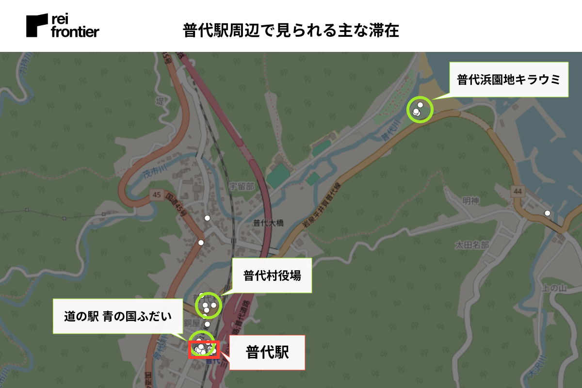他の駅と比べると滞在が少ないですが、道の駅を併設しているため駅周辺と「普代浜園地キラウミ」に滞在が見られました。