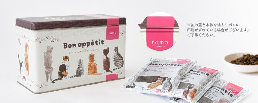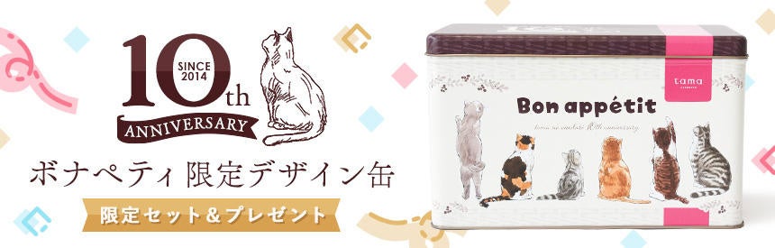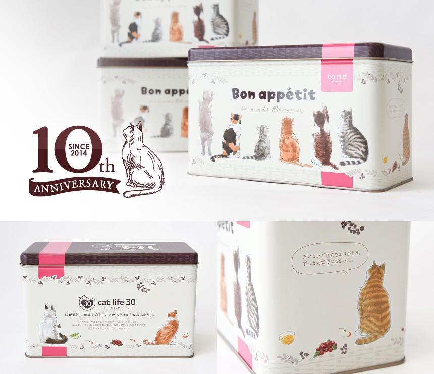 「tama」の誕生から今年で10年。皆さまのご愛顧とかわいい猫たちに支えられ、成長を続けられていることに心からの感謝を込め、10周年記念品として、tamaブランドのドライフード『ボナペティ』のパッケージをデザインしたアニバーサリー缶をご用意しました。小分けサイズのドライフードの保管やオモチャ・小物の収納としても便利です。ボナペティのパッケージにデザインされている猫11匹が勢ぞろいです。