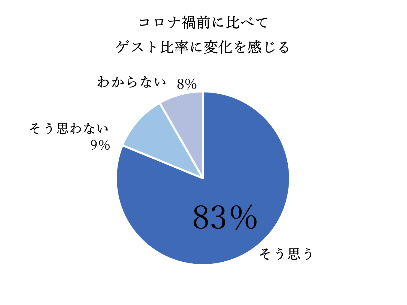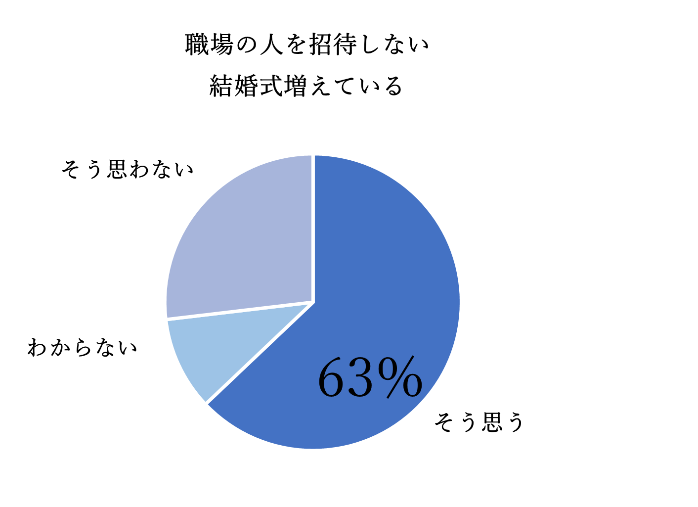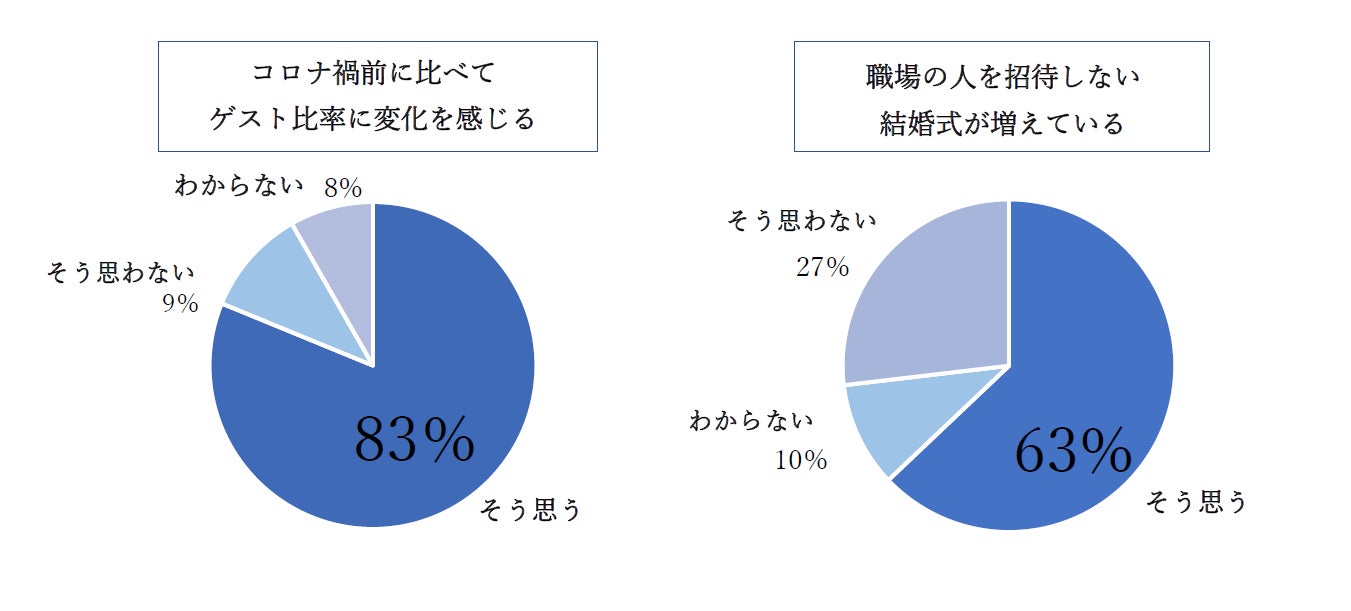 コロナ禍前と現在を比較し、結婚式のゲスト構成の変化について調査したところ、83%のウェディングプランナーが「ゲスト構成が変化している」と回答。また、63%のウェディングプランナーが「職場の人を招待しない結婚式が増えている」と回答しました。職場の人を招待しない理由としては、「行動制限などの影響で招待人数を抑えなくてはならない時期が続き、“結婚式=職場の人を招待するもの“というイメージが薄れたことで、親族・友人のみの結婚式に違和感がなくなった」「しばらく会えなかった人たちとの貴重な再会のきっかけなので、堅苦しくない雰囲気で行いたい」などが多く、コロナ禍で結婚式の捉え方や大事にしたいポイントが見直されていることが分かりました。