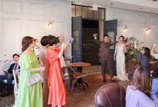 ゲストは挙式の入場シーンでご新郎ご新婦の姿をその日初めて見ることが一般的ですが、最近では待合スペースに挙式前のおふたりがサプライズで登場することも。ゲストは一気に盛り上がり、写真を撮影したり、ウェルカムドリンクで乾杯したりと、久しぶりの再会を喜んでいます。(アーセンティア迎賓館静岡/塩谷紗帆)