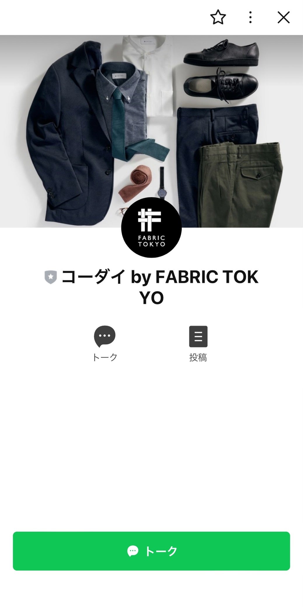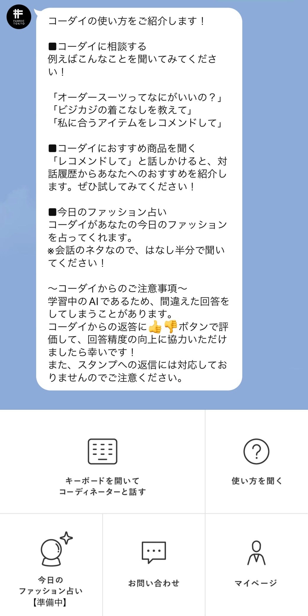 本プログラム「コーダイ by FABRIC TOKYO」(以下「コーダイ」)は、店舗スタッフであるコーディネーターとして、LINE公式アカウントのトークルーム上でお客さまと対話を行います。
