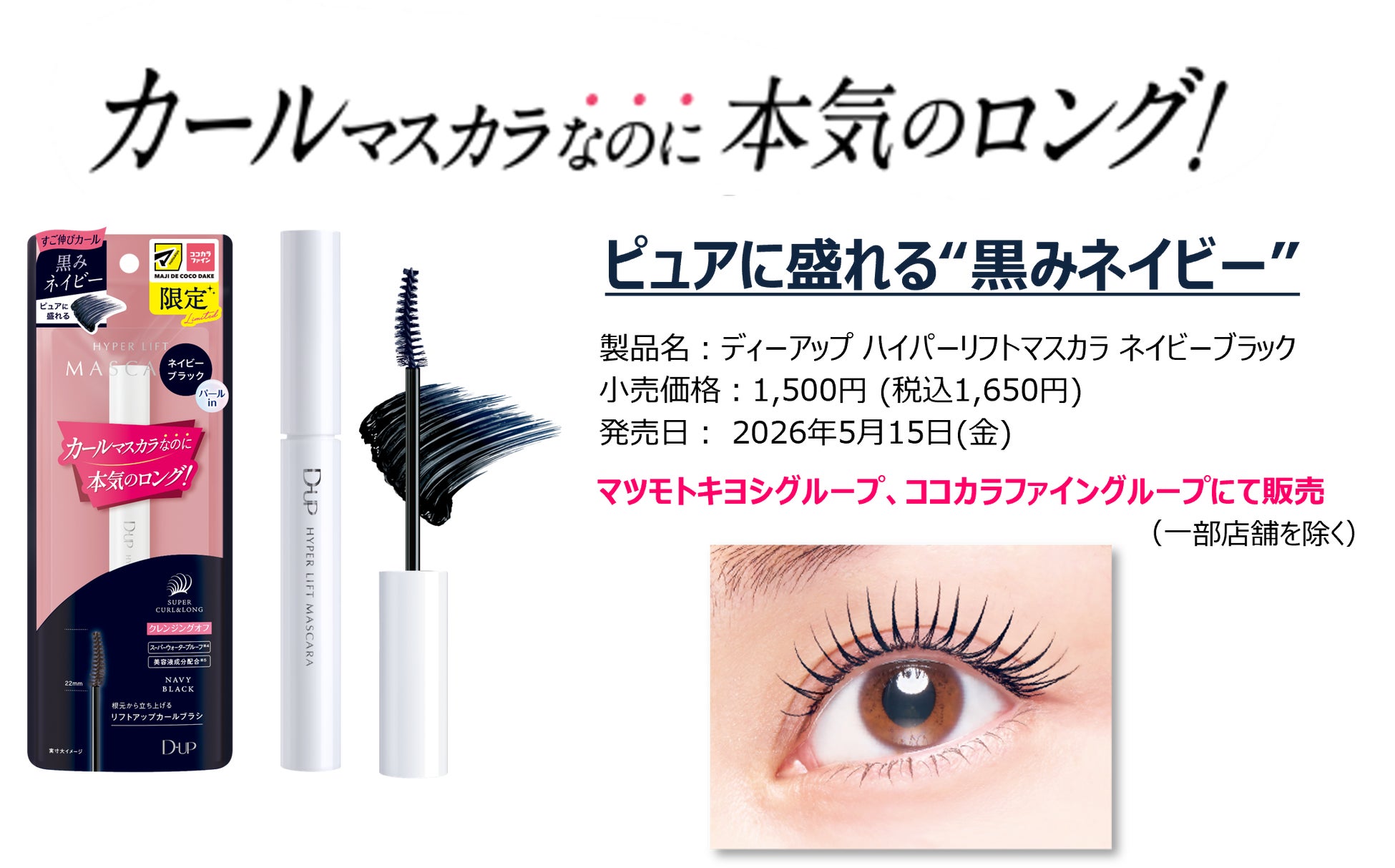 株式会社ディー・アップ(本社:東京都港区、代表取締役:塩野 弘明)は、2026年5月15日(金)より、ディーアップマスカラ&アイライナーシリーズ「ハイパーリフトマスカラ」の新色「ネイビーブラック」を、全国のマツモトキヨシグループ、ココカラファイングループの店舗(一部店舗を除く)、マツキヨココカラオンラインストア、ディーアップ公式オンラインストア(https://store.d-up.co.jp/)限定で発売いたします。