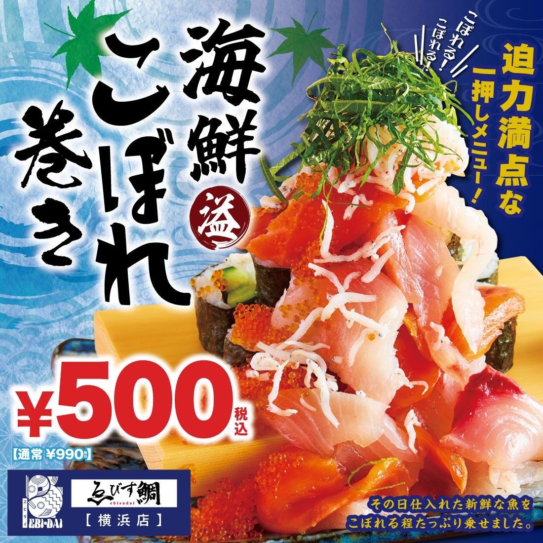 毎朝仕入れる鯛をはじめとした海鮮料理が自慢の店「ゑびす鯛 横浜店」(運営:株式会社TBI JAPAN、本社:東京都新宿区、代表取締役社長 後藤 浩之)は、8月15日の”刺身の日”を記念して、迫力満点な名物メニュー【海鮮こぼれ巻き】を通常980円のところ、ワインコインの500円で提供するキャンペーンを、2022年8月8日(月)~21日(日)の期間限定で実施いたします。