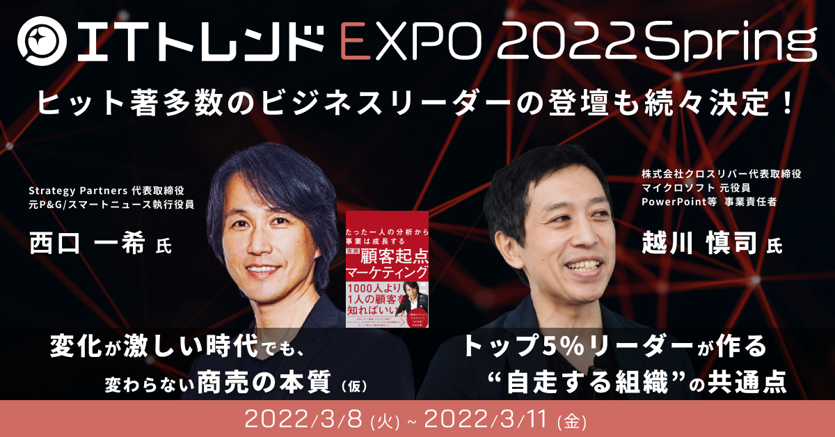業界最大級のオンライン展示会「ITトレンドEXPO2022 Spring」、ヒット著多数のビジネスリーダーの登壇も決定!公開講演数は100を突破!