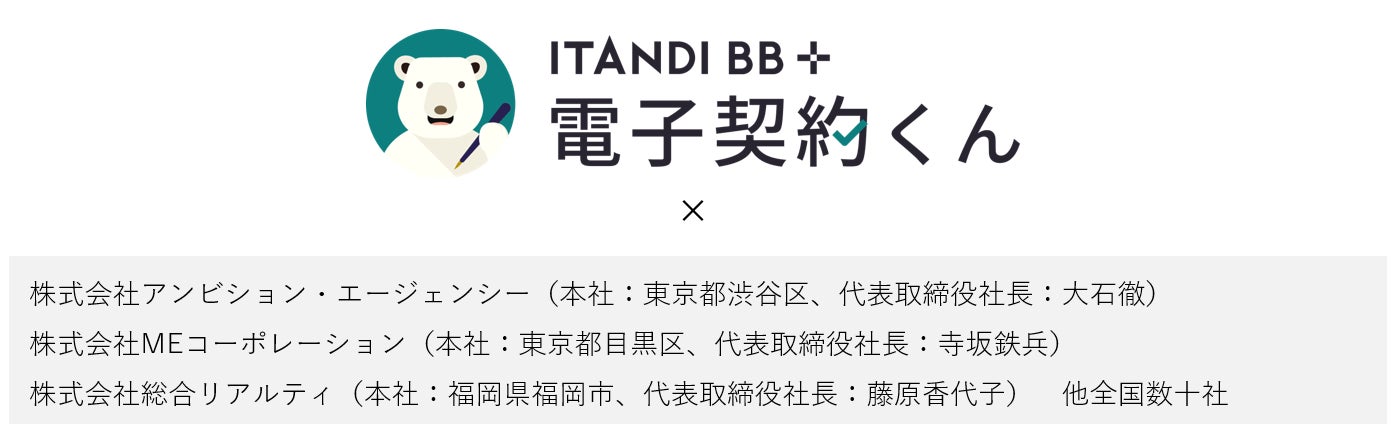 テクノロジーで不動産の賃貸取引をなめらかにするイタンジ株式会社は、2022年8月度、株式会社アンビション・エージェンシー、株式会社MEコーポレーション、株式会社総合リアルティを含む全国数十社の不動産管理事業を営む不動産会社(以下「不動産会社」)へ、不動産関連電子契約システム「電子契約くん(https://lp.itandibb.com/denshi-keiyaku/)」を導入したことをお知らせします。