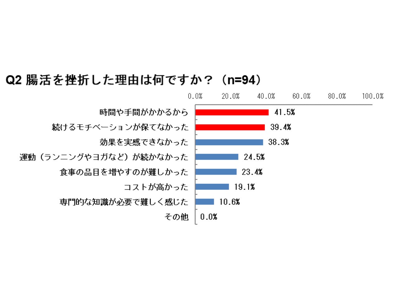さらに、今回ジャパンフリトレーが実施した調査によると、腸活に取り組んだことのある人のうち、6割以上の方が腸活に挫折しているという実態があります。(Q1)主な理由は「時間や手間がかかる」「続けるモチベーションを保てなかった」などで、腸活は継続することに高いハードルがあることが明らかになりました。(Q2)