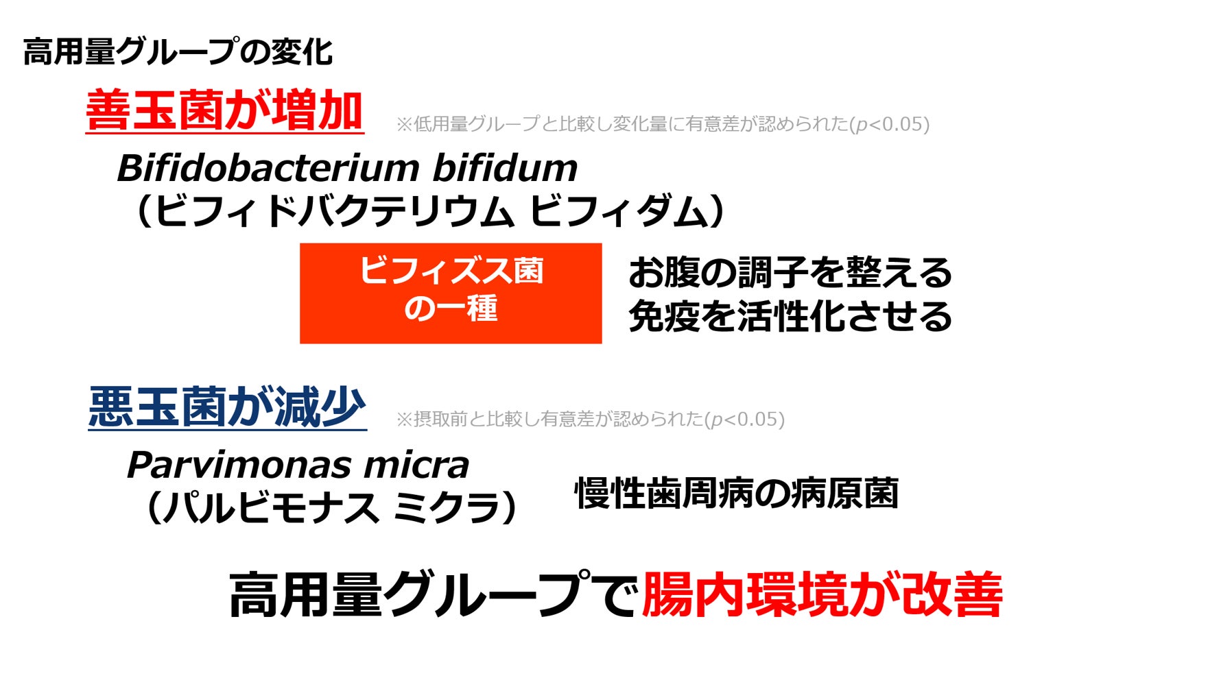 高用量グループにおいて、善玉菌が有意に増加し、悪玉菌が減少したことを確認しました。