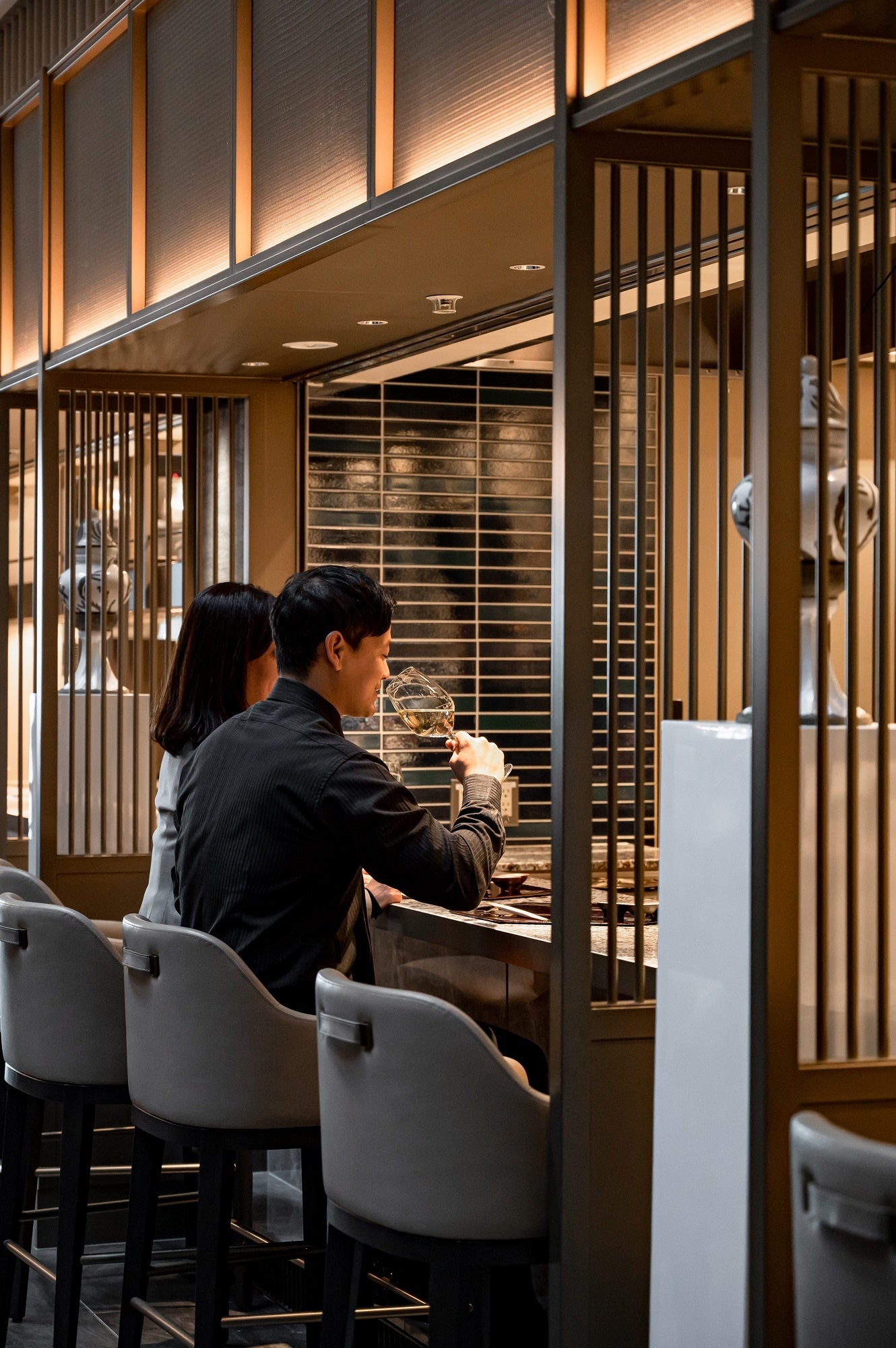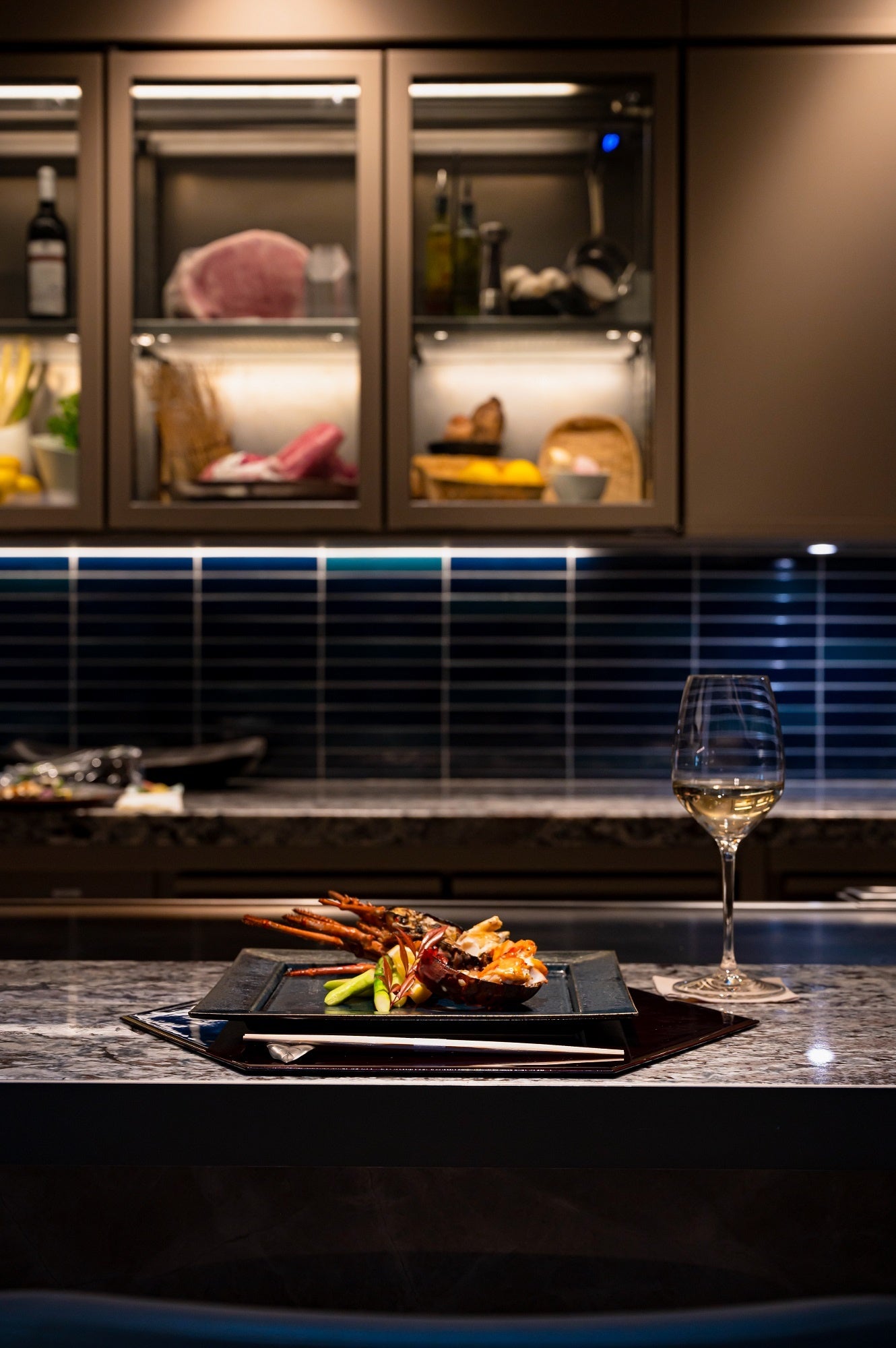 職人の技を目の前で堪能しながら、選び抜いた銘柄牛と山の幸、海の幸を楽しめる鉄板焼「風音」(かざね)。アトリウムの中央、カフェ&バー「リュトモス」とイタリアングリル「メロディア」の奥に位置し、リズム、メロディ、ハーモニーの3つの要素が融合した美しい音楽に、鉄板の上で食材を焼く音や立ちのぼる香りが風格を加えます。歌舞伎の下座音楽にもある「風音」(かざおと)をヒントに、音色のバリエーションや変化を、歌舞伎や雅楽の伝統的な舞台構成である「序破急」と捉え、3 種類の鉄板焼のコース料理をご用意しています。カウンター越しにシェフとの会話を楽しむ贅沢な空間です。