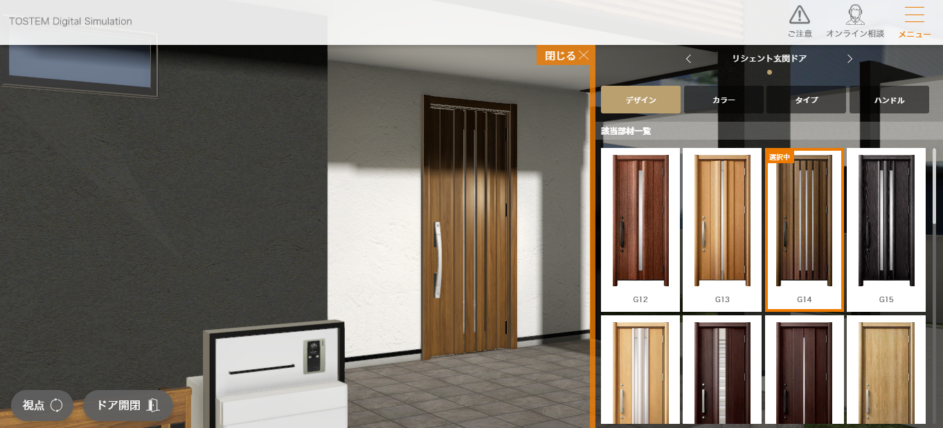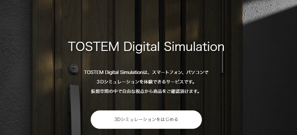 TOSTEM Digital Simulationは、スマートフォンやPCで、玄関ドアや窓の3Dシミュレーションを体験できるサービスです。リアルに近い感覚で、仮想空間の中で自由な視点で商品をご選定いただけます。