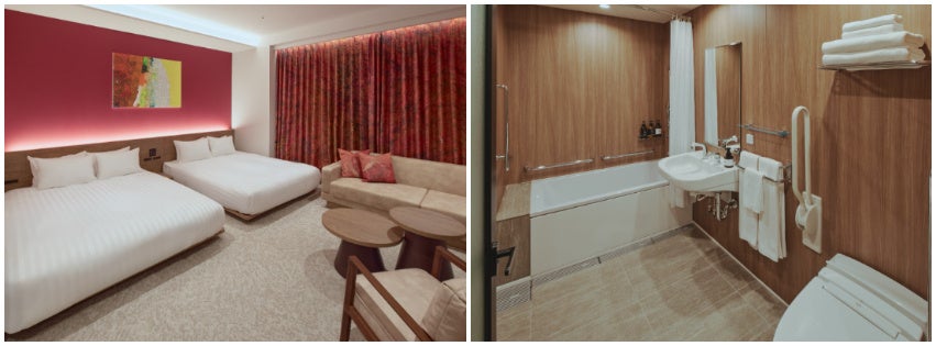 障がいを抱えた方にも快適にご利用いただけるユニバーサルルームは、へラルボニーとのコラボレーションによる特別なアート空間です。アーティストの作品から生まれたテキスタイルデザインが、カーテンやクッション、壁掛けアートに採用されており、ご滞在をお楽しみいただけます。