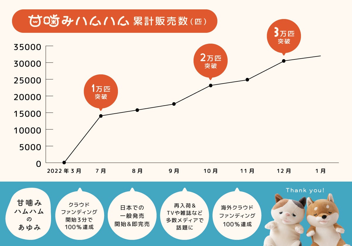 甘噛みハムハムは、ユカイ工学として異例の初回2万匹製造という大きな挑戦を行い、その挑戦も1ヶ月も経たずに「完売」という素晴らしい結果を得ることができました。その後も増産を続け、ホリデーシーズンも多くのお求めをいただくことができ、あっという間に3万匹を突破しました。