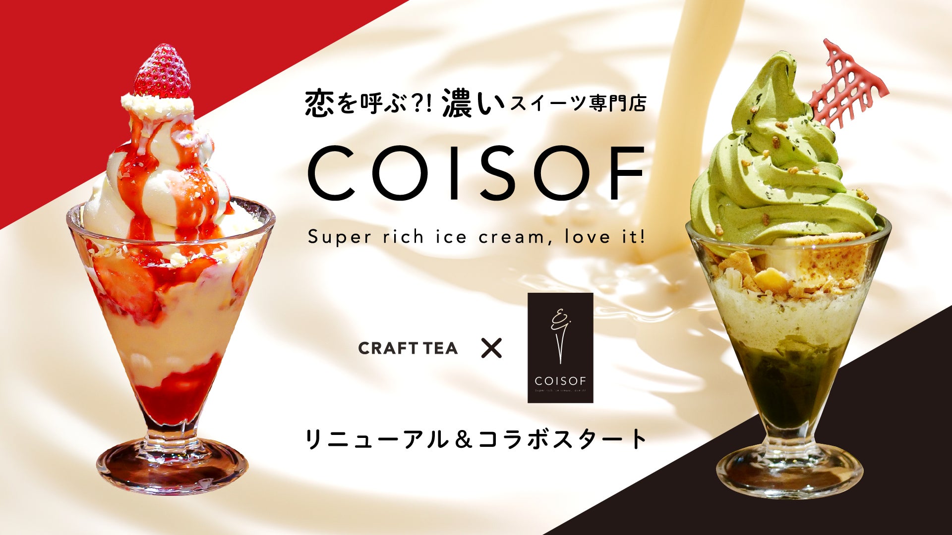 リニューアル記念第一弾は、静岡県の高級茶ブランド「CRAFT TEA」のお茶やプロテインを使ったメニューを販売いたします。リニューアルしたcoisofで新メニューをお楽しみください。(HP:https://coisof.jp/)