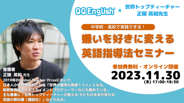 【QQEnglish × 世界トップティーチャー 正頭英和先生】教育関係者向けに、嫌いを好きに変える英語指導法をテーマにした無料ウェビナーを11/30(木)に開催します