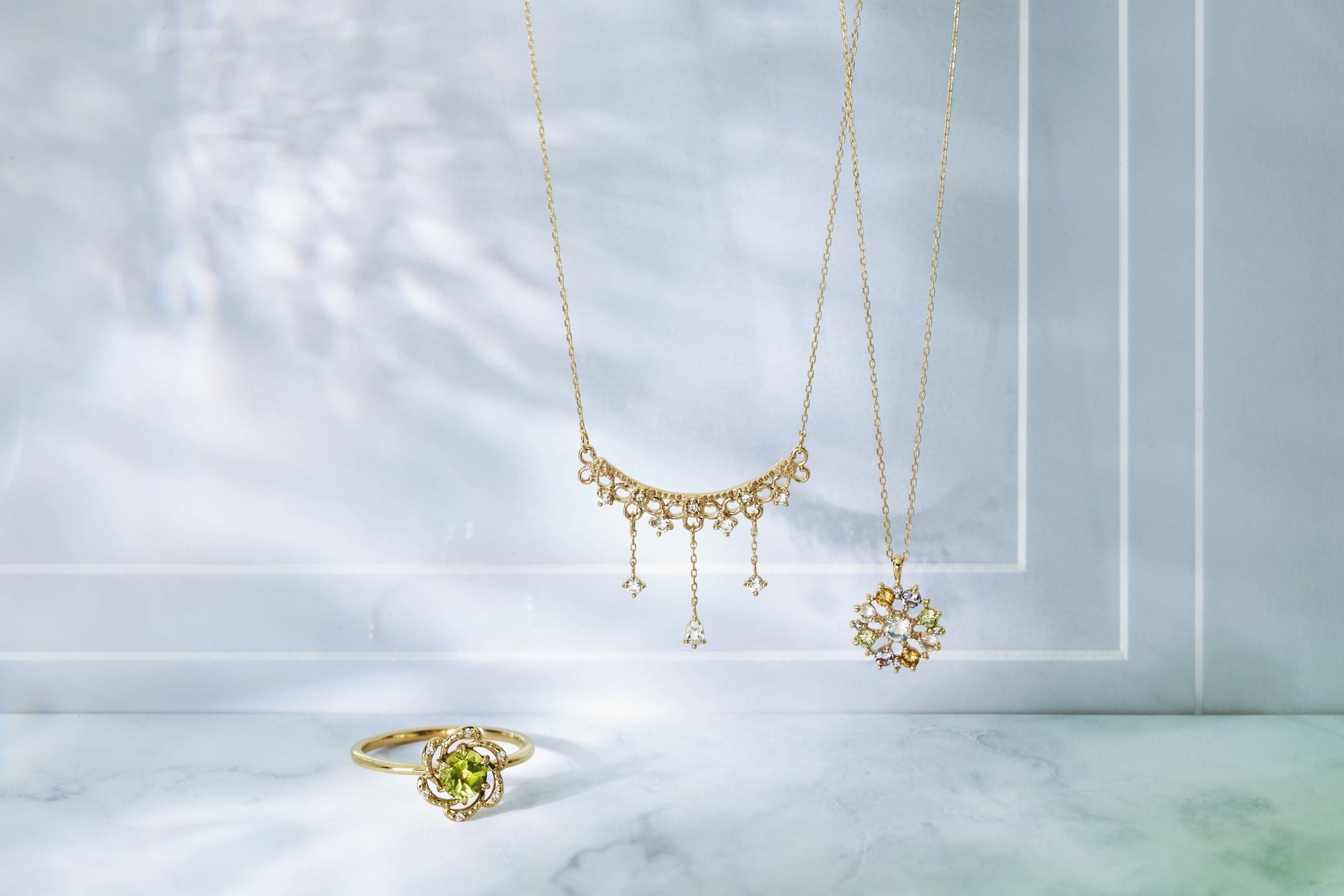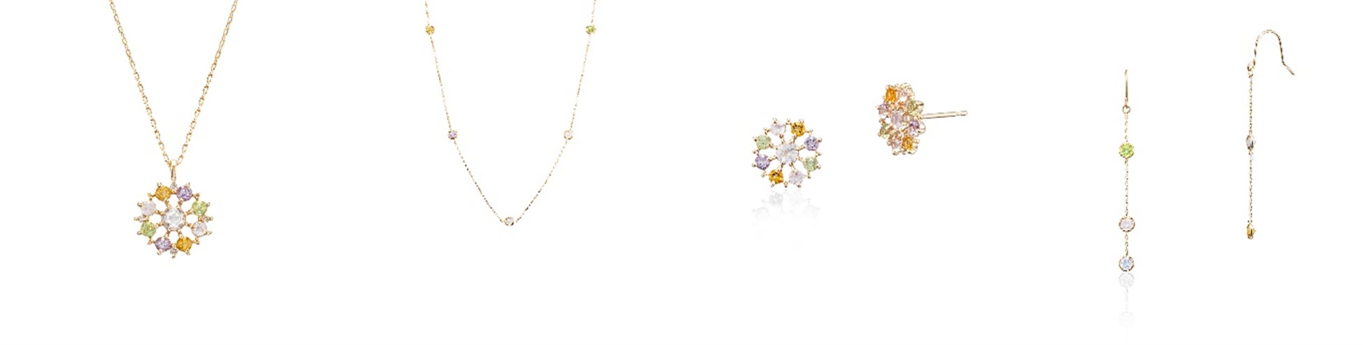 細部までこだわったエレガントなデザインに、ブルートパーズ、ペリドット、フェルスパーなど色鮮やかなカラーストーンをあしらうことで、シンプルな中にもEAU DOUCE4℃らしさが感じられるコレクションに。