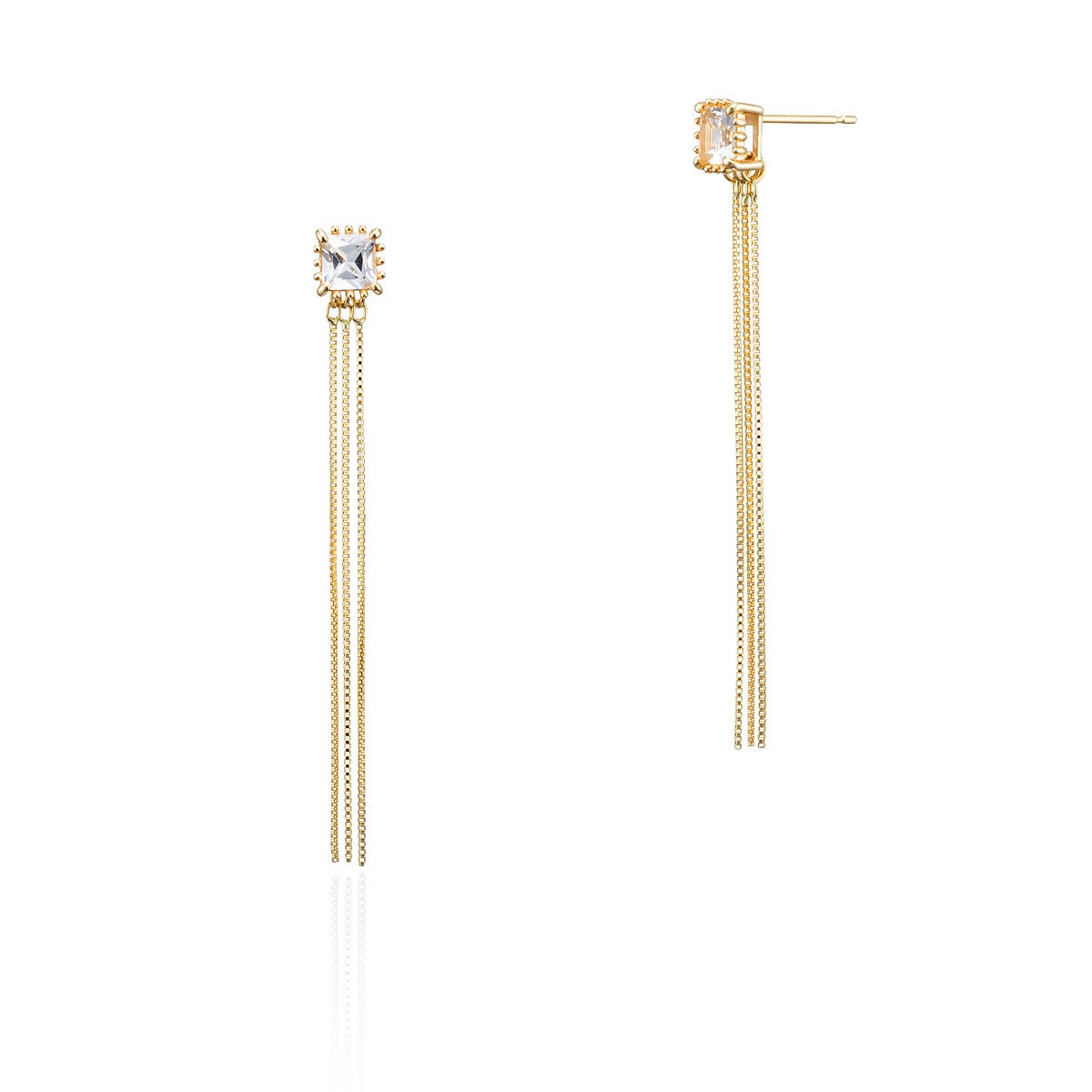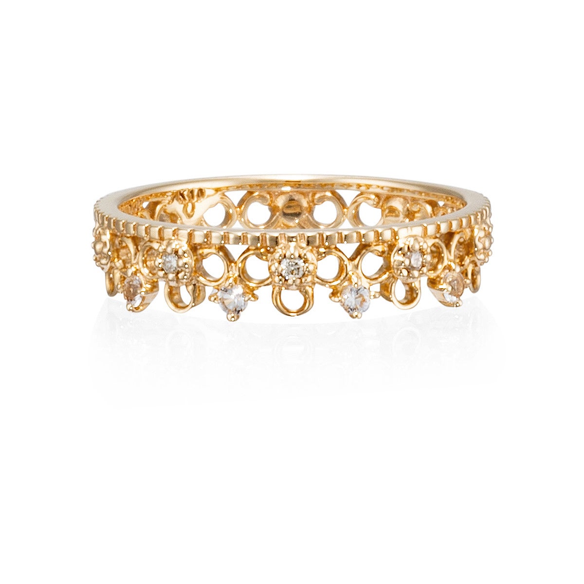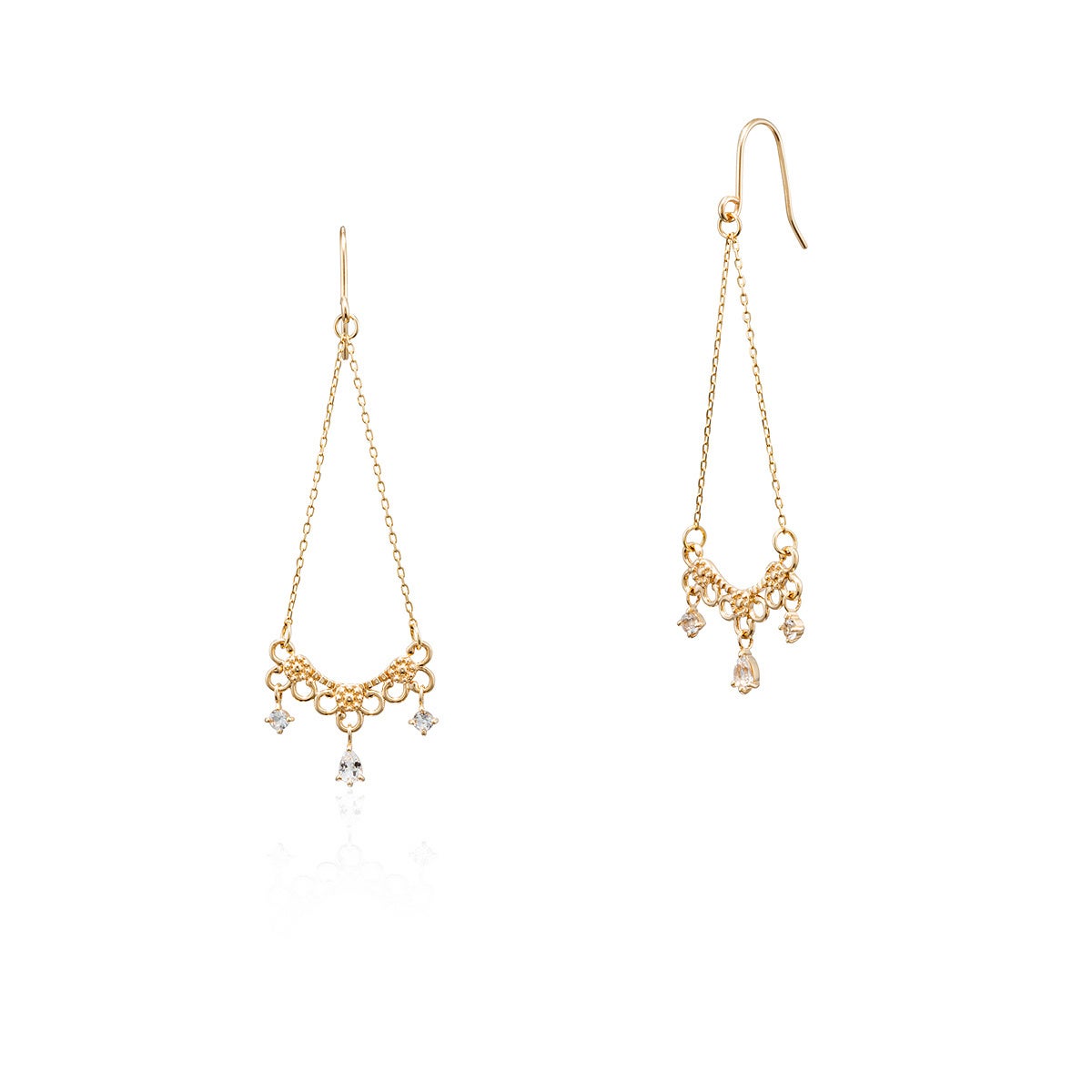 ホワイトトパーズのクリアな輝きをふんだんにあしらい、地金には細かなミル打ちや刻みの加工を施した、細部の装飾まで美しい特別なジュエリー。ヴェルサイユ宮殿を象徴する豪華絢爛なシャンデリアをイメージさせ、一目見た瞬間に目を惹くクラシカルなデザインです。