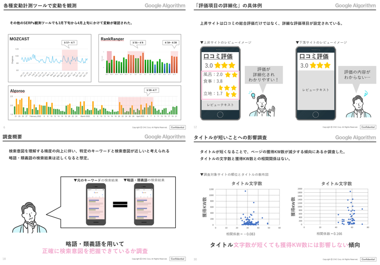 CINCでは日頃からクライアントのWebサイトに適切な指針、施策を提案するべく、検索結果の動向を研究しており、それらの見解をまとめ、「アルゴリズムアップデートレポート」として毎月発表しています。CINCアナリシスグループ渾身の分析によって作成される本レポートは、クライアントから「毎回とても参考になる」「分析が緻密すぎる」など高い評価を頂いています。