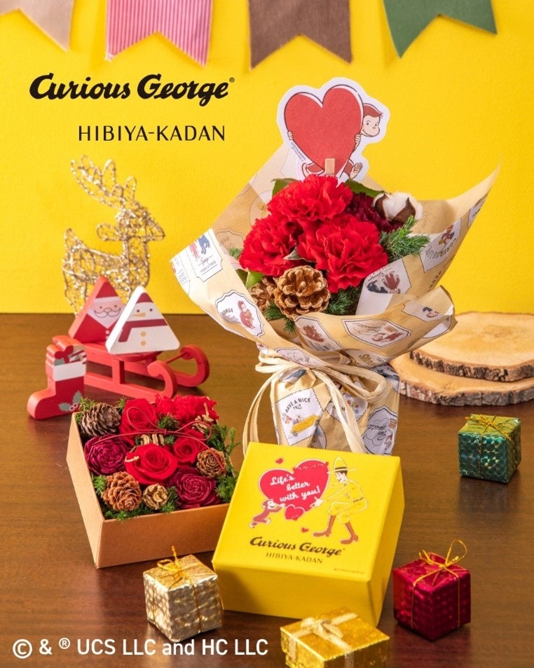 株式会社日比谷花壇とのコラボアイテムが実現しました。プリザーブド&ドライフラワーアレンジメントやそのまま飾れるブーケが「おさるのジョージ」限定デザインで登場です! クリスマスらしいお花をぎゅっと詰め込んだこの時期だけのオリジナルアイテムです。