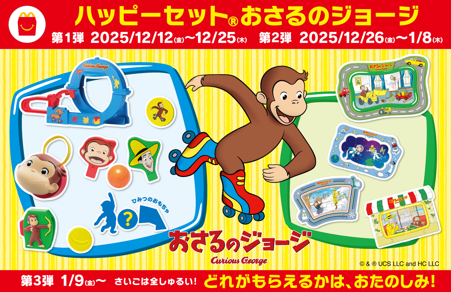 今年もハッピーセット「おさるのジョージ」が販売中! いち早く85周年のスタートを盛り上げています。12月26日(金)からは第二弾が販売予定。第二弾は、両面で遊べるジグソーパズル。裏面はパズルを組み立てた後、「間違い探し」「めいろ」などで遊んだり、飾って楽しめます。さらに、今回のハッピーセットはデジタルゲーム付き!対象のハッピーセットのおもちゃをスマートフォンのカメラで読み込んで、ジョージと一緒にゲームを楽しもう!