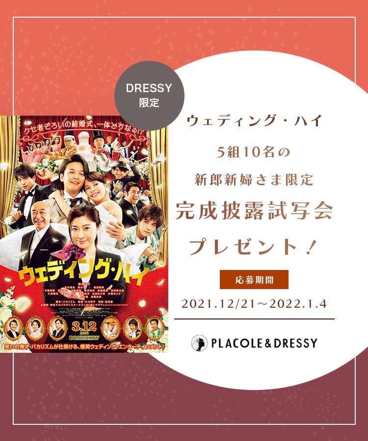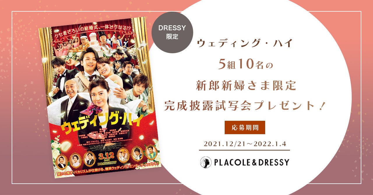 花嫁アプリ「PLACOLE & DRESSY」を運営する、冒険社プラコレ(本社:神奈川県鎌倉市、代表取締役CEO:武藤功樹)は結婚準備中の新郎新婦へ、映画「ウェディング・ハイ」の完成披露試写会に5組10名の新郎新婦様をご招待することが決定しました。