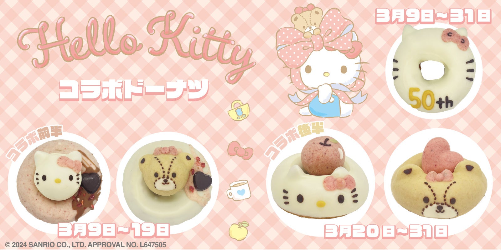 また、コラボ期間中ハローキティ50thアニバーサリーリングドーナツも登場いたします。