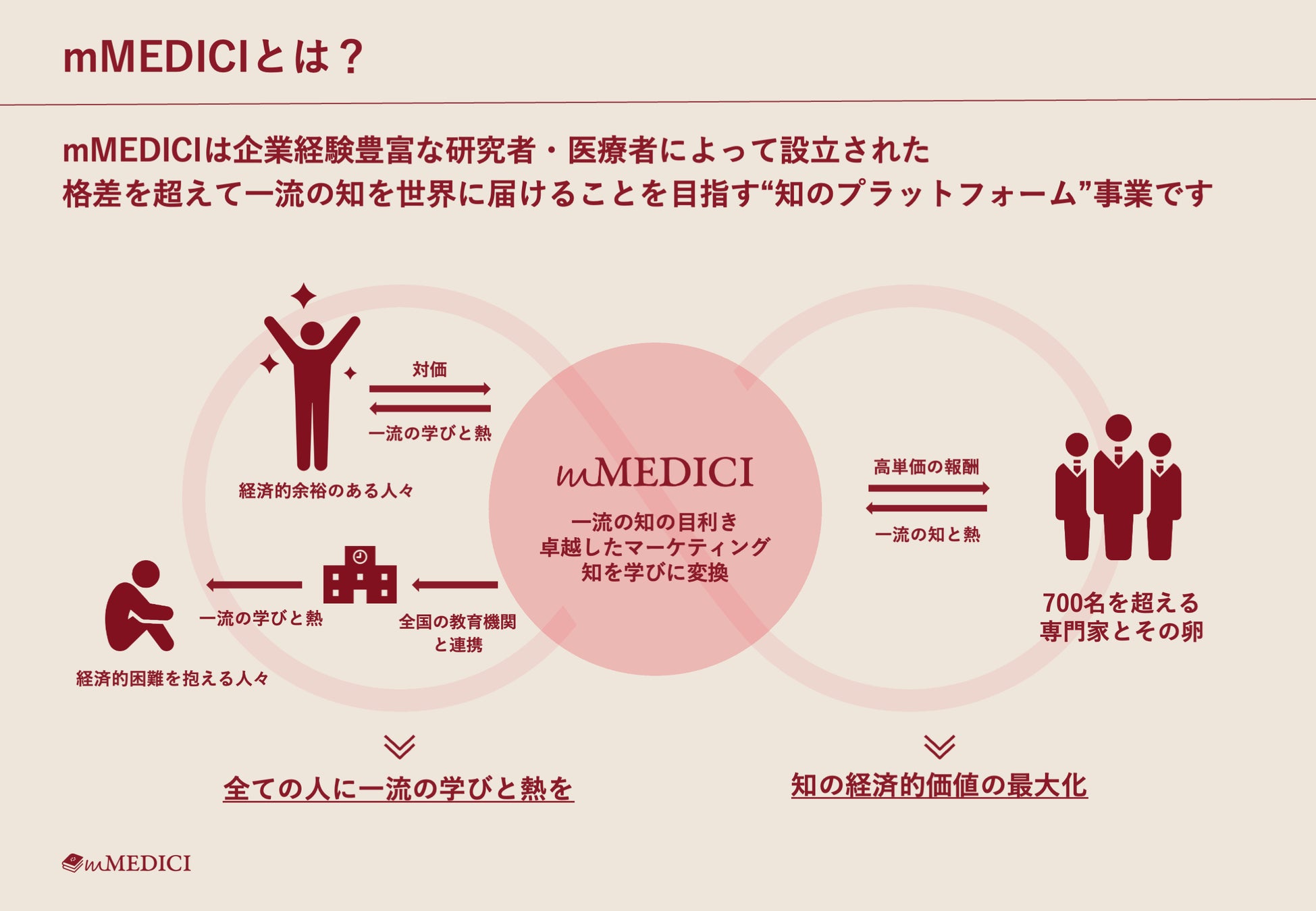 mMEDICIはメンバーが医学研究者・医療職で構成されるスペシャリスト集団であり、メンバー自身が「情報の目利きができる」という強みを有しています。特に運営するシンクタンクmJOHNSNOWは産官学から約700名のスペシャリストとその卵がフェローとして集まり日本最大級の規模となっており、ヘルスケアの様々な領域に対するソリューションを提案することが可能です。