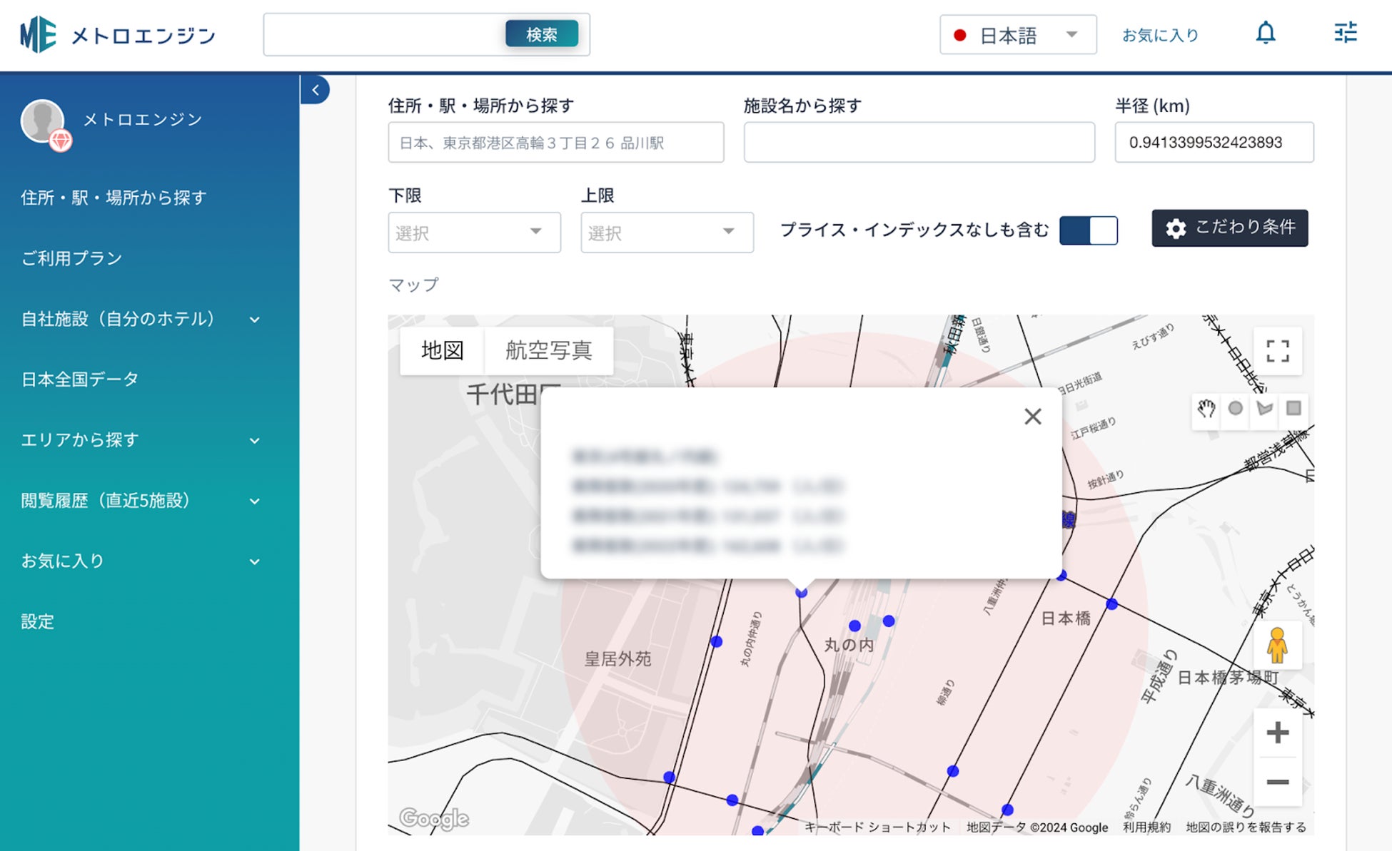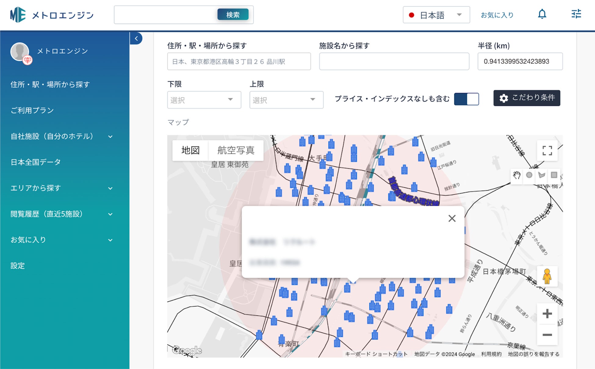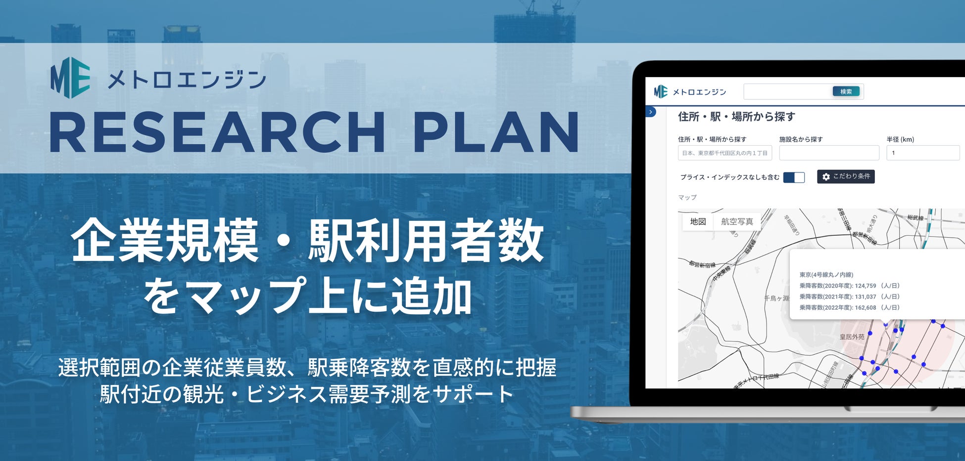 宿泊施設向けレベニューマネジメントツール『メトロエンジン』を提供し、宿泊業界のDX化や集客支援を行うメトロエンジン株式会社(本社:東京都品川区、代表取締役CEO:田中良介、以下メトロエンジン)は、宿泊施設・市場の調査分析ツール『メトロエンジン リサーチプラン』において、選択したエリア内の企業およびその従業員数、さらに駅の乗降客数を地図上で表示できる機能を追加いたしました。これにより、観光・ビジネスなど目的別に宿泊需要の予測が立てやすくなり、より精度の高いマーケット分析が実現できるほか、ホテルの法人営業にも情報をご活用いただけます。