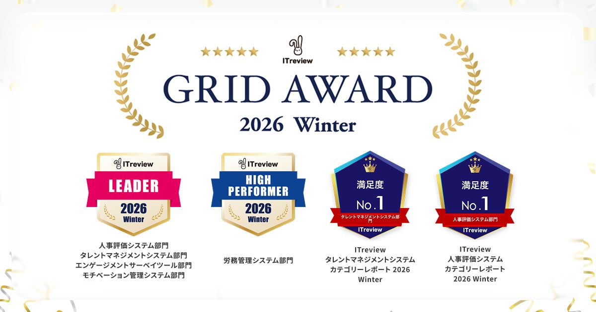 株式会社HRBrain(東京都港区、代表取締役CEO:堀 浩輝、以下「当社」)が提供する、タレントマネジメントシステム「HRBrain」は、「ITreview Grid Award 2026 Winter」の「人事評価システム部門」「タレントマネジメントシステム部門」「エンゲージメントサーベイツール部門」「モチベーション管理システム部門」の4部門にてユーザー満足度と認知度の高い製品に贈られる称号「Leader」を受賞したほか、「労務管理システム部門」において「High Performer」を受賞いたしました。