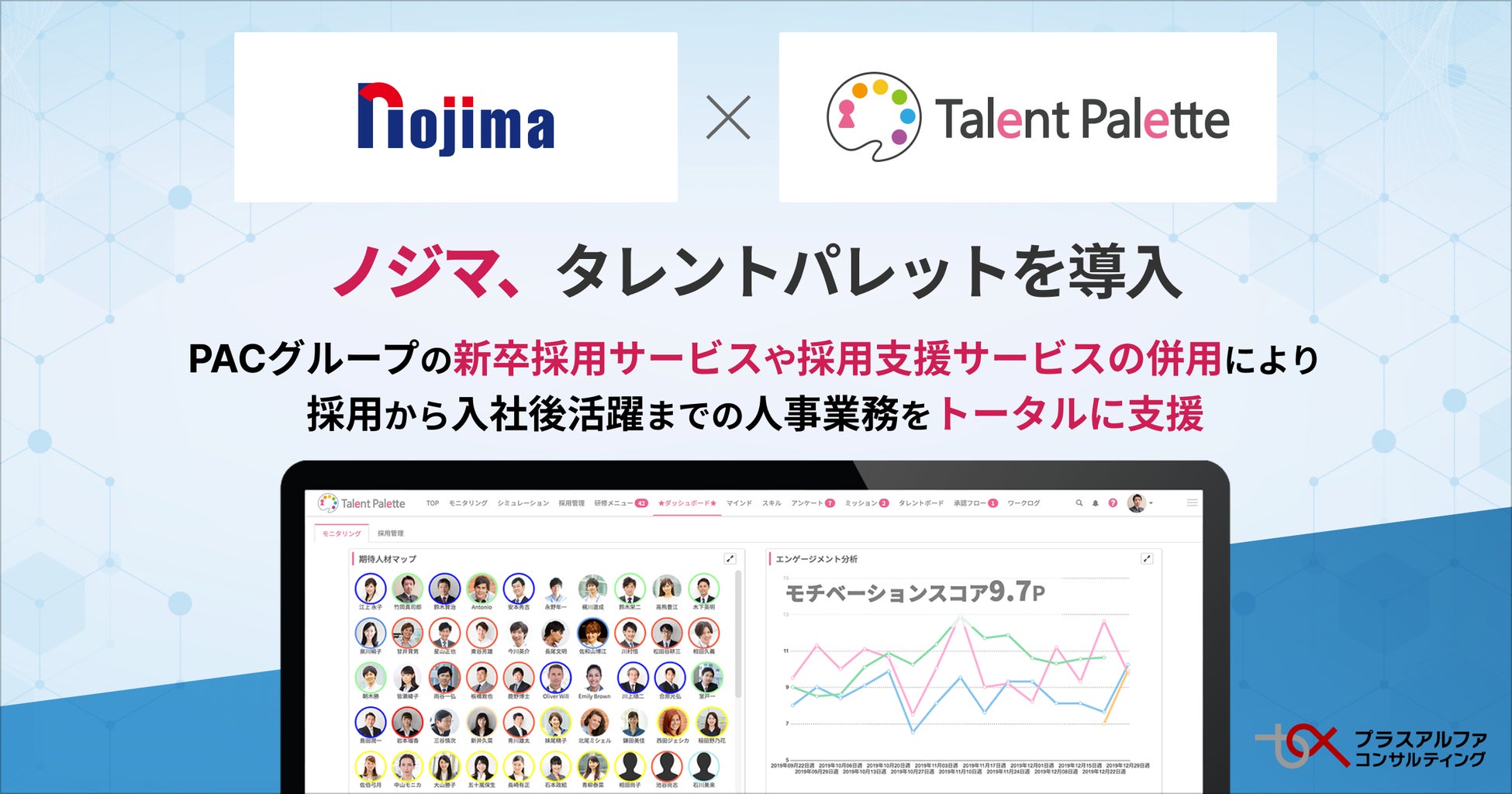 株式会社プラスアルファ・コンサルティング(本社:東京都港区、代表取締役社長:三室克哉 証券コード:4071、以下「PAC」)は、科学的な人材活用や人的資本の開示、人事業務のDX化、リスキリングの推進などを背景に、多くの大手企業で導入が進んでいるタレントマネジメントシステム「Talent Palette(以下:タレントパレット)」を株式会社ノジマ(本社:神奈川県横浜市、代表執行役社長 野島廣司、以下「ノジマ」)に導入いただきましたことをお知らせいたします。