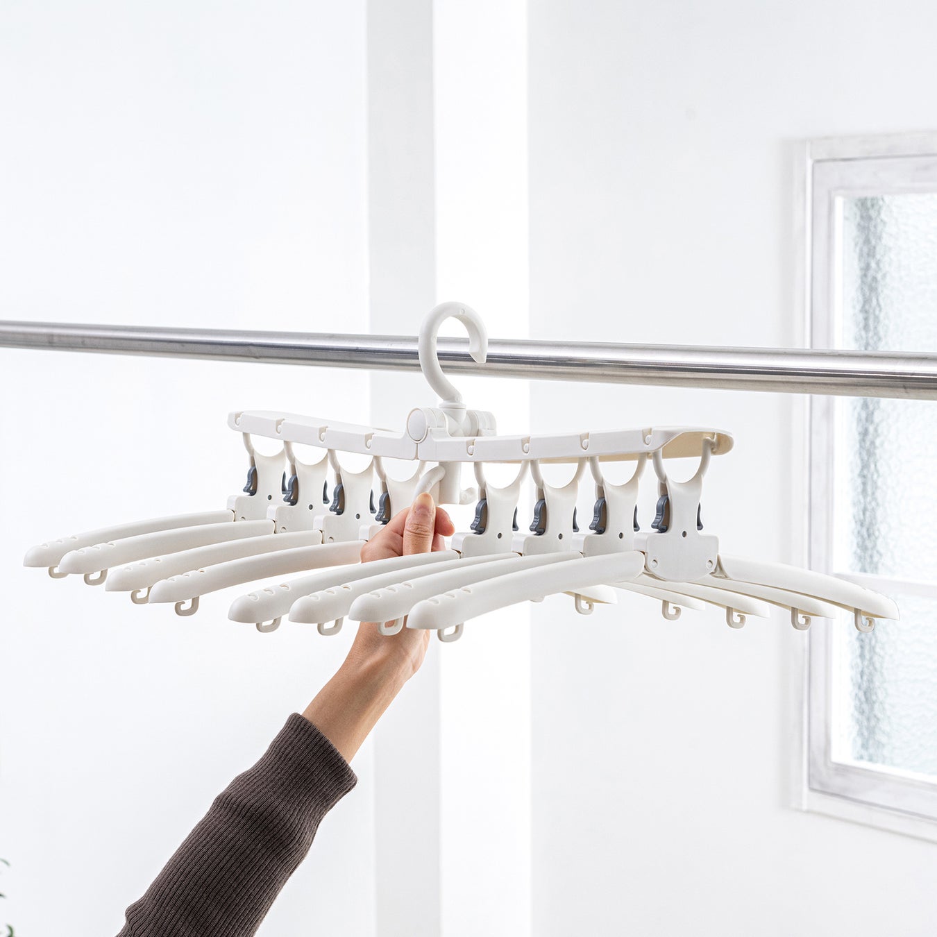 8つのハンガーが連結している大型ハンガーですが、ひっくり返すことでサッとスリムに折りたためるので、使用しないときは場所を取らずにスッキリ収納できます。