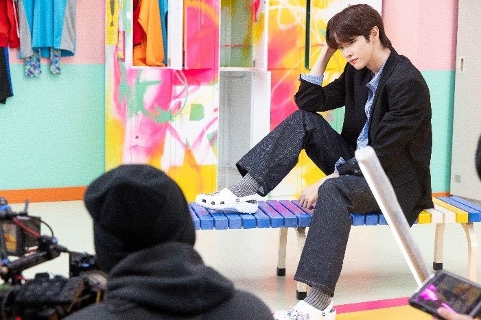 「クラシック クロッグ」のキャンペーンムービー撮影では、先ほどとは打って変わってキュートでポップな撮影セットにチェンジ。衣装もカジュアルテイストで、靴下を合わせた色とりどりの「クラシック クロッグ」で登場。ソヒさんは順調に個人撮影を終えた後も、ご自身のスマートフォンで様々な角度を試しながら自撮りを楽しむ姿が印象的でした。ウンソクさんはセットの雰囲気に合わせ、大きな瞳を輝かせながら終始ニコニコとした表情で撮影。ソンチャンさんは抜群のスタイルでどんな撮影コンセプトもクールにこなし、颯爽とOKカットをさらいました。