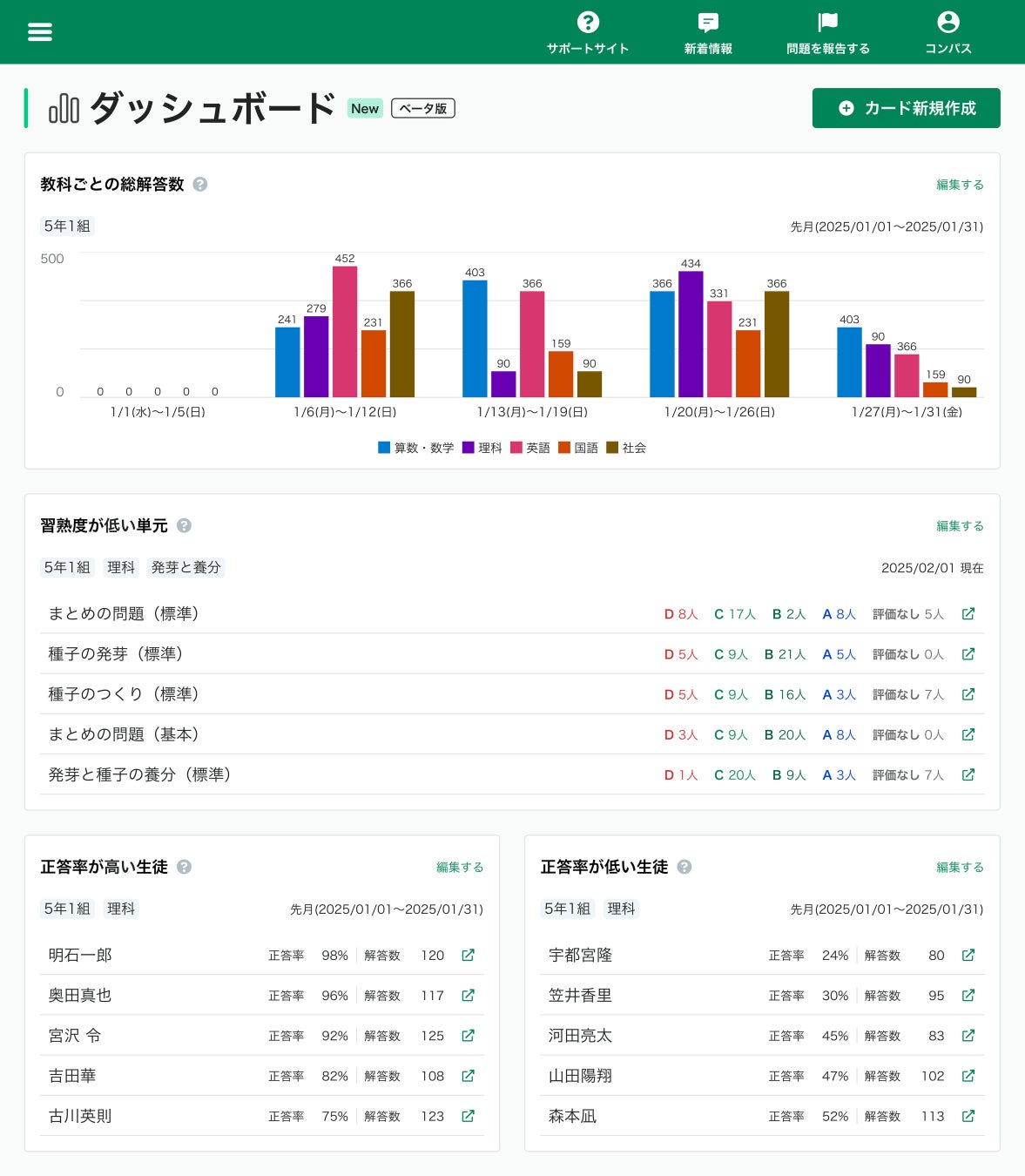 教科毎の総解答数 - 各教科の解答数を集計し、クラス毎・クラス横断での学習量や取組状況を簡単に把握できます。