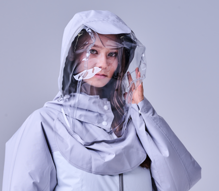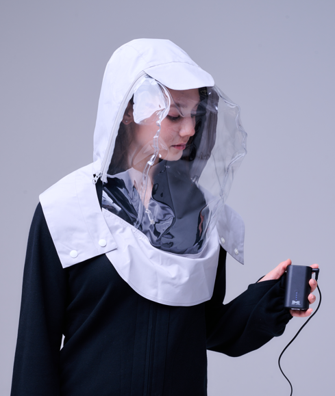 ● フード部:柔らかい透明ビニール素材のフェイスガード一体型フードで、顔・首・頭部をしっかりカバー。フードにファンを内蔵し、顔周りにこもった熱と湿気を排出します。また、狭い空間の中に顔がある圧迫感を軽減します。(一体型の時は、背中のファンからの風が入りますが、フード部分だけ使う時にファンを使用します)