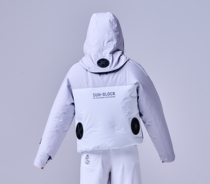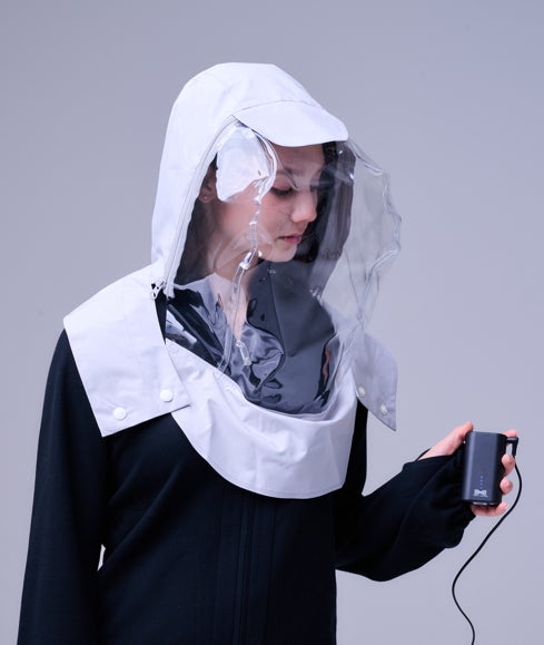ファン付きUV防護服は、完全遮光の特殊生地とバッテリー搭載の空調ファンを組み合わせた衣類です。着用時に衣服内部へ外気を取り込み、熱や湿気を排出するとともに汗を乾かすことで気化熱の働きにより体温を一定に保つことを期待したものです。「守る」と「涼しい」を両立させた、光線過敏症の方々の外出をサポートするために生まれた特殊な衣料品です。