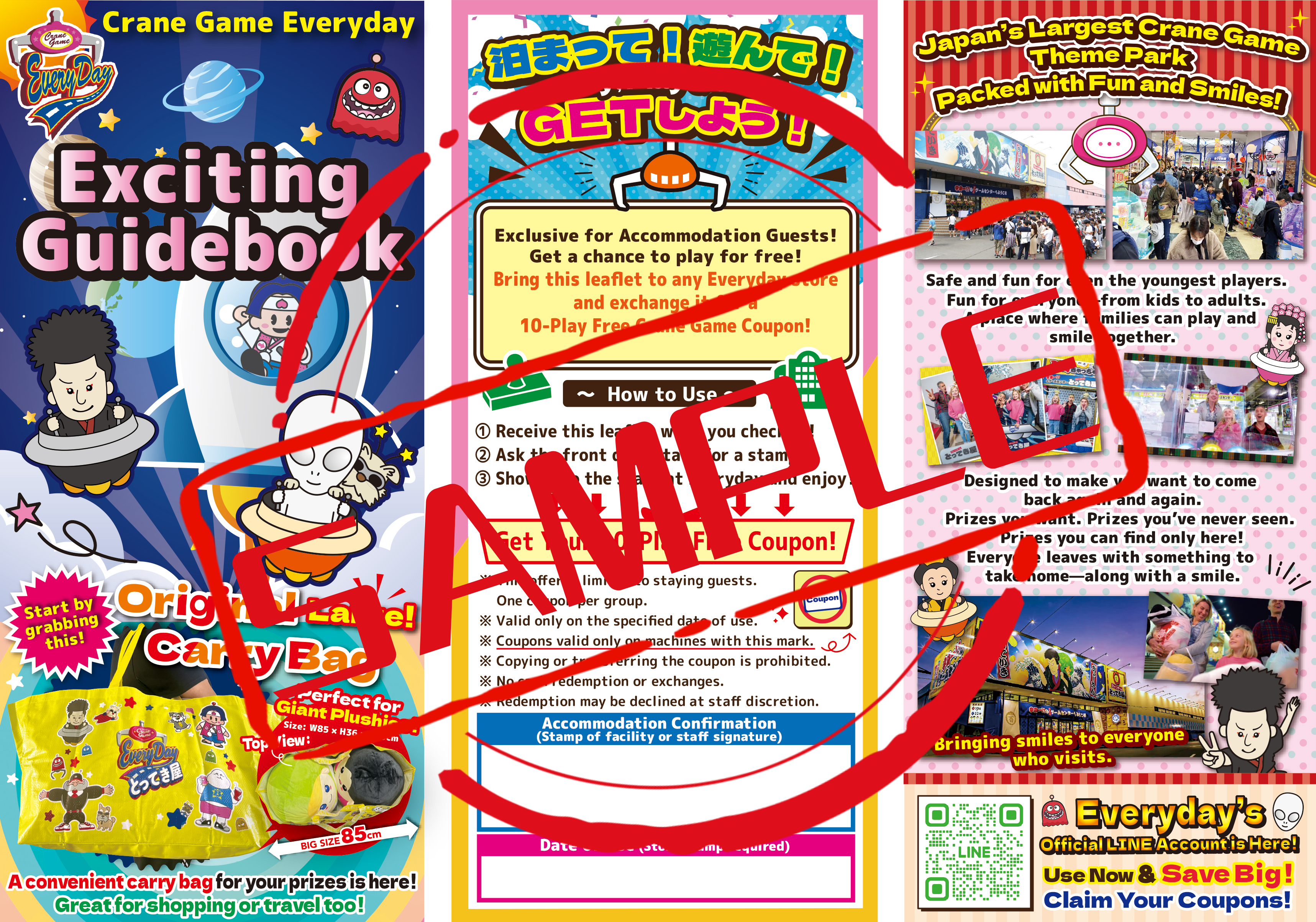 宿泊者はリーフレットを店舗に持参することで、クレーンゲーム10回分の無料プレイ券と交換でき、実際に体験をお楽しみいただけます。