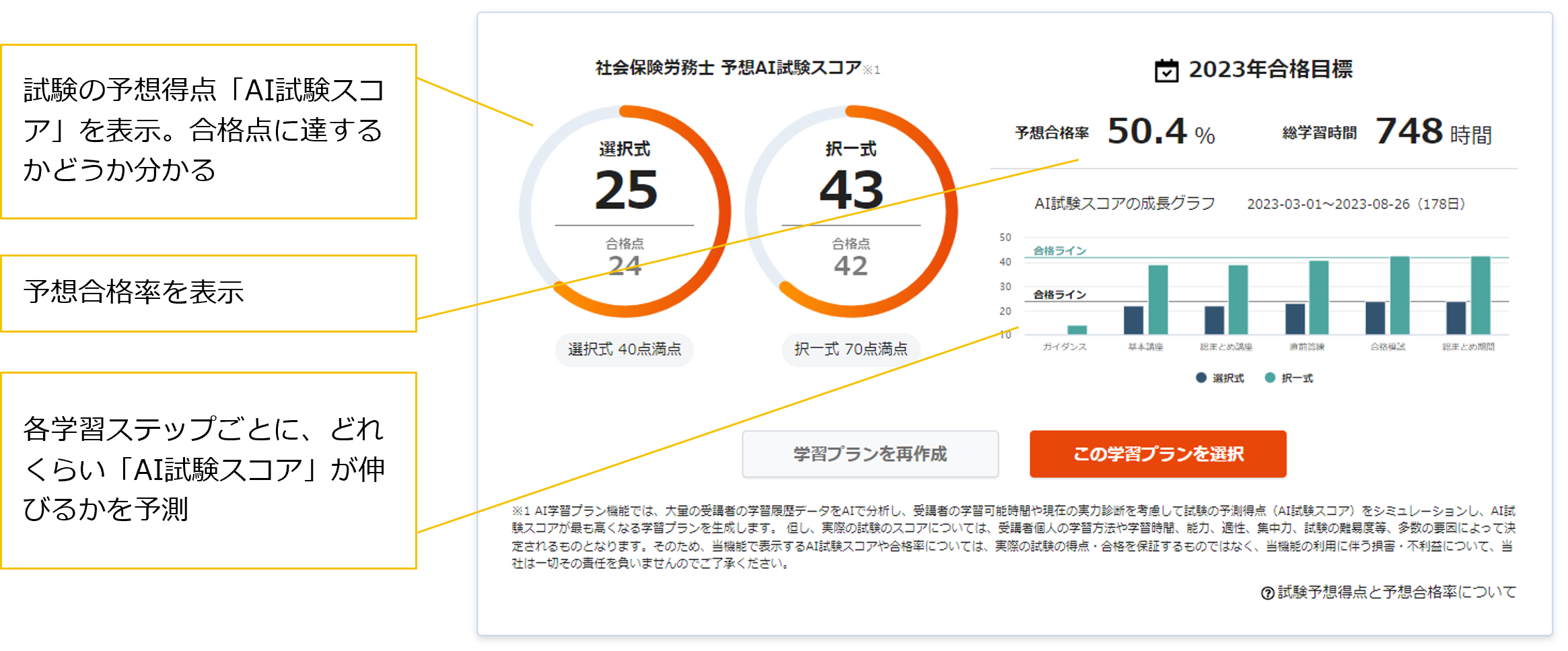 AI学習プラン機能では、受講者が最も試験の予測得点が高くなる学習プランを作成します。そして、試験の予測得点「AI試験スコア」と「予想合格率」が表示されます。