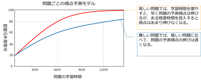 また、得点予測の際には、学習後に時間の経過につれて記憶が忘却する「忘却曲線効果」を含めて計算するなど、各種データとAIを活用して、複数の要因を基に予測を行っています。
