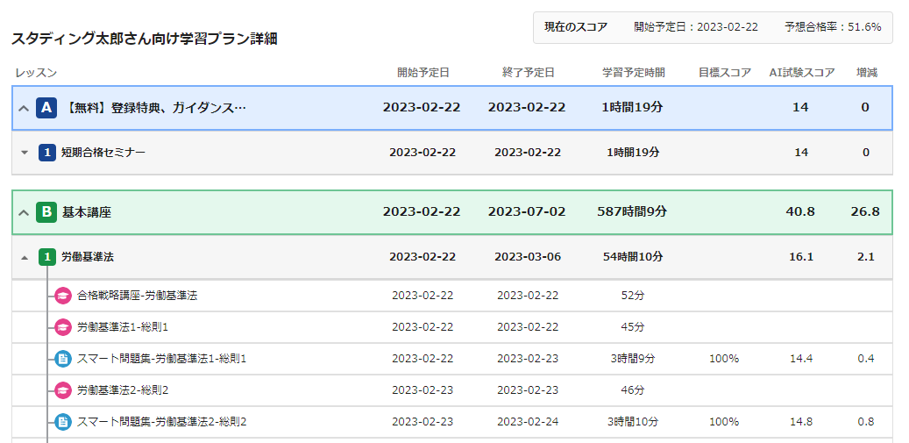 そこでスタディング社会保険労務士講座では、受講者に最適な学習計画を、AIが個人別に作成する「AI学習プラン」を導入いたしました。このシステムは、受講者が確保できる学習時間と、学習をスタートする日を入力することで、AIが、過去の受講者による膨大な学習履歴データを分析して、最も得点が伸ばしやすい試験日までのスケジュールを個別に作成します。講座受講者は、AI学習プランを見れば「今日、何をどこまでやればいいのか」がわかるので学習順番はもちろん、ペースにも迷いません。