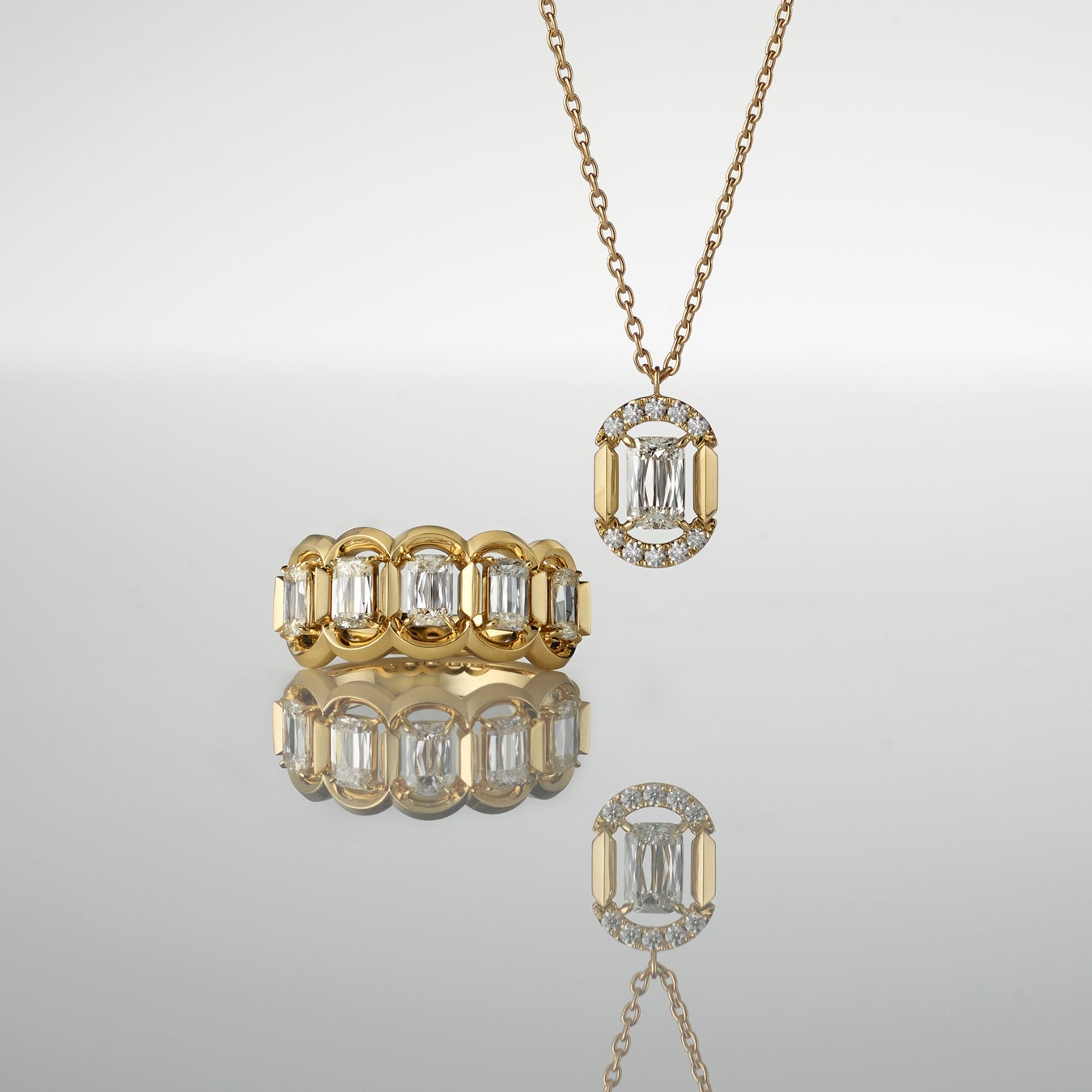 (左から)指輪 税込¥1,980,000(18KYG、ダイヤモンド)、 ネックレス 税込¥1,199,000(18KYG、ダイヤモンド、センターストーン0.5ct)