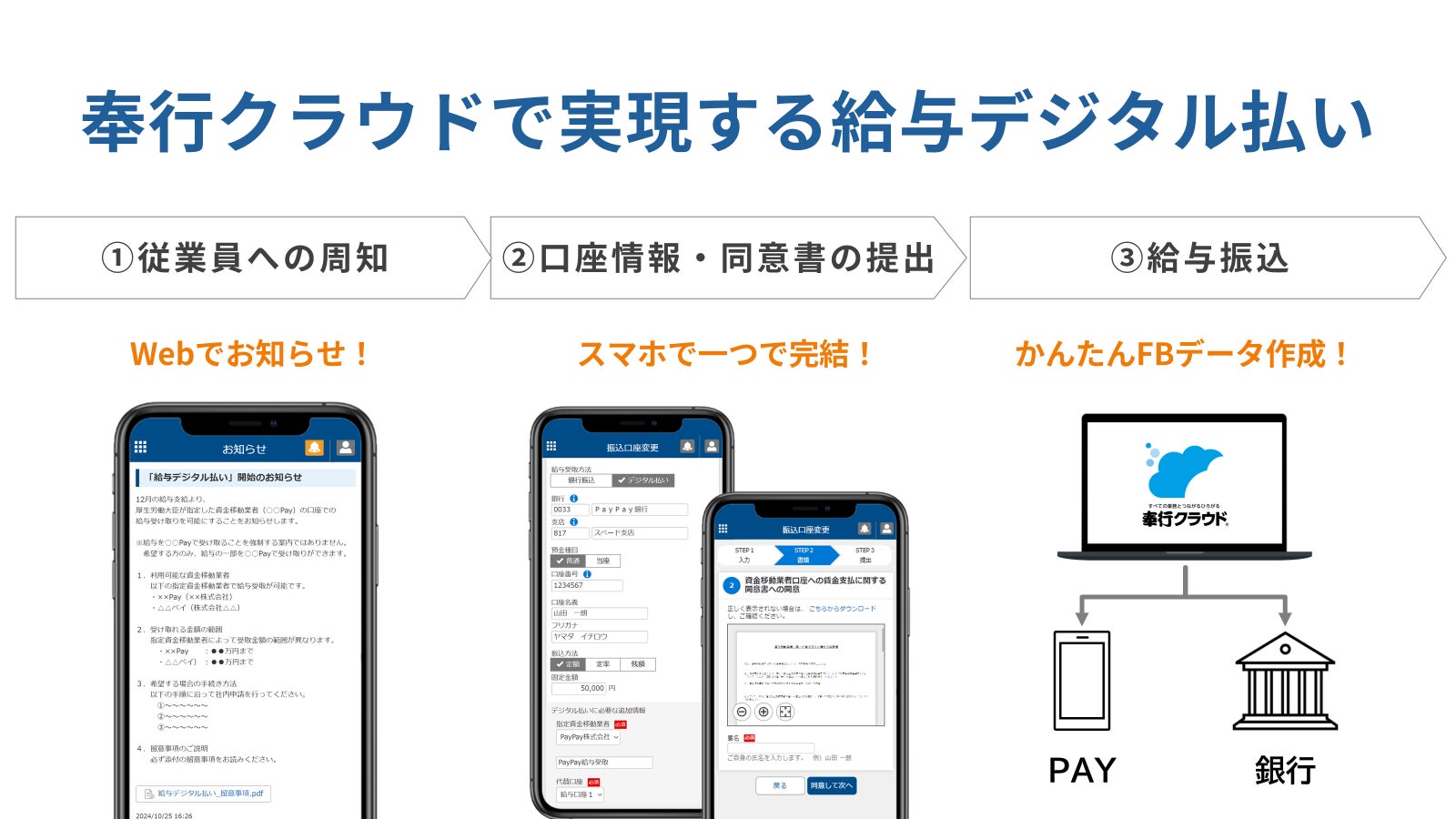 OBCはこのたび、バックオフィス担当者が業務負荷をかけずに給与デジタル払いを導入できるよう、『奉行クラウド』をご利用のお客様向けに、簡単に給与デジタル払いに対応できる機能を提供開始いたします。