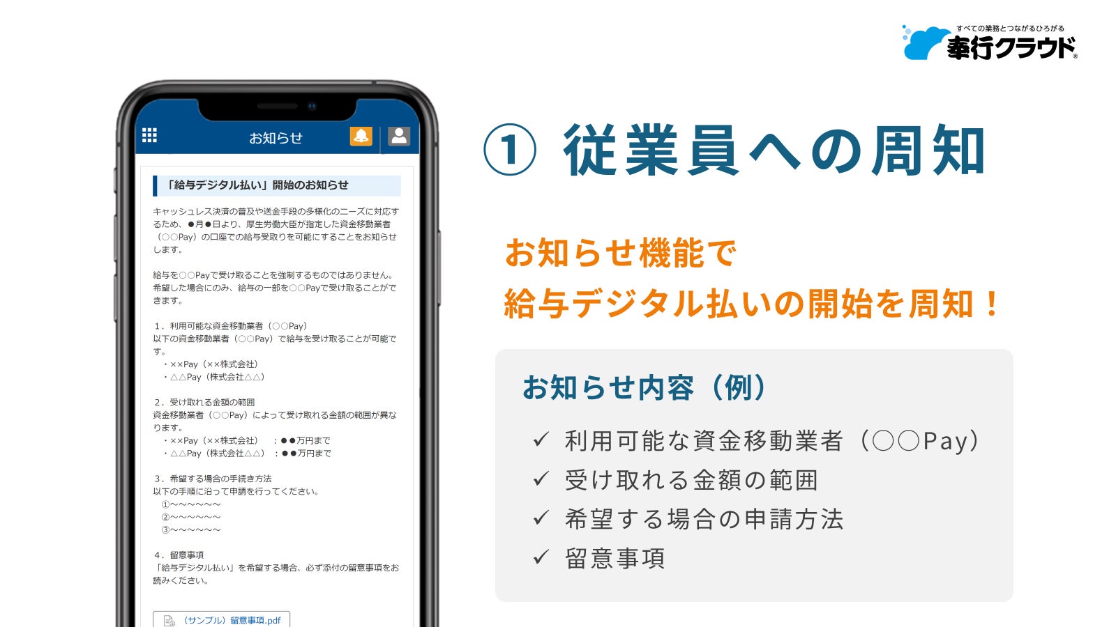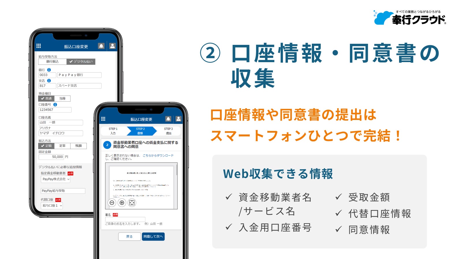企業が給与デジタル払いを導入する際に必要な「①従業員への周知」「②口座情報・同意書の収集」「③給与振込」をすべてデジタルでスムーズに行える機能を提供いたします。