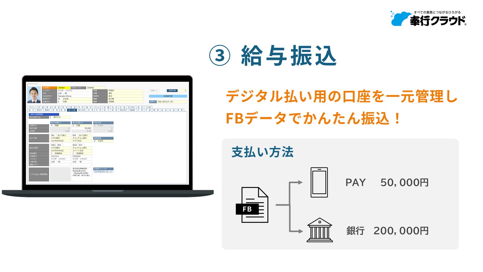 『給与奉行クラウド』では、通常の銀行振込用の口座とデジタル払い用の口座の両方を一元管理でき、銀行振込(FB)データをつかってスムーズに振り込むことができます。