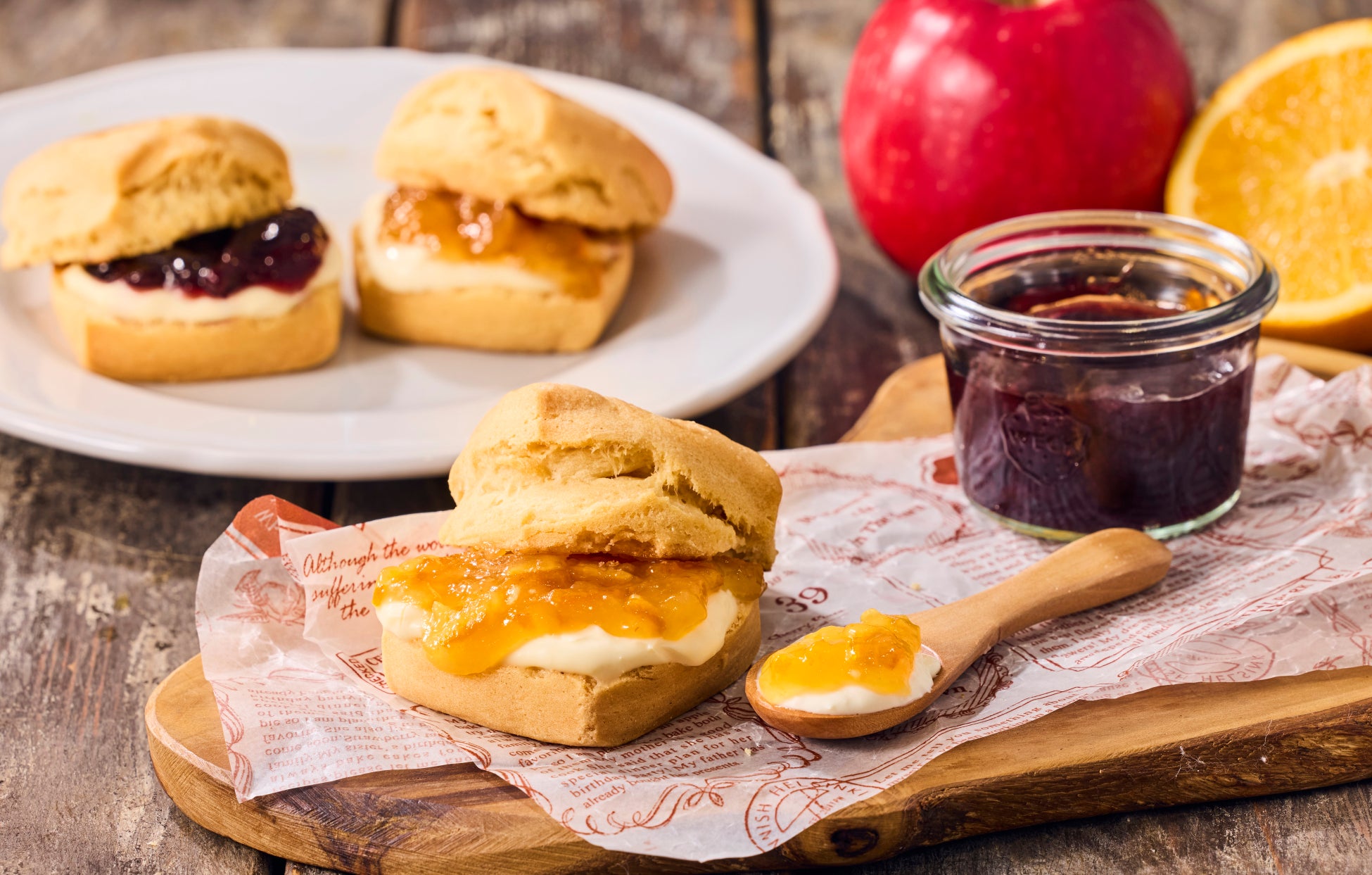 外はふんわり、中はしっとり。注文を受けてからグリドルでリベイクした香ばしいスコーンに、なめらかで酸味がある北海道産クリームチーズと砂糖不使用で果実本来の甘さを濃縮したフルーツジャムをサンドしました。オレンジ果肉の甘味と、ピールのほど良い苦味が特徴の「マーマレード」、濃厚でコクのある果実の甘さが特徴の「ブラックチェリー」、りんごの甘酸っぱさとシナモンが合わさった風味豊かな味わいの「アップルシナモン」の3種類からお選びいただけます。