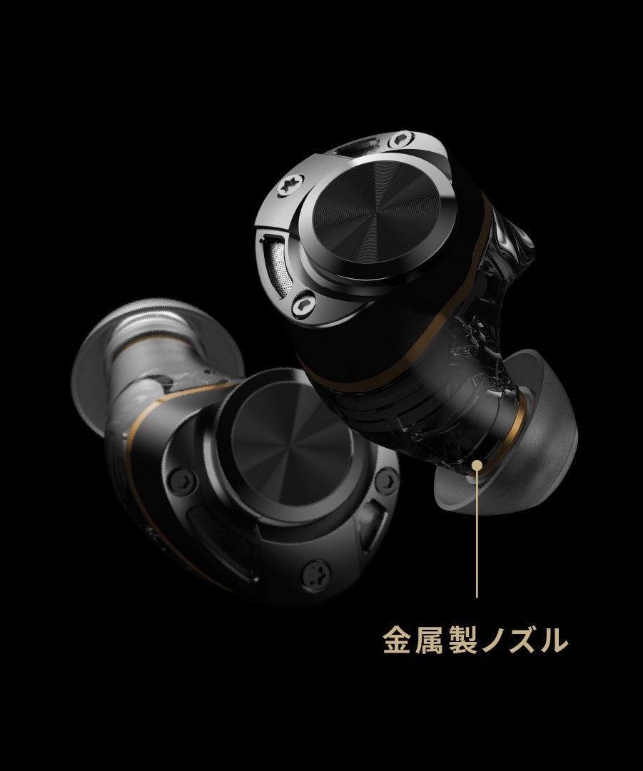 一般的な完全ワイヤレスイヤホンでは樹脂素材が使われることの多いノズル部分に、カスタムIEM(イン・イヤー・モニター)でも使用される金属製のノズルを採用。高硬度・高比重・高精度な音道造形により、重心バランスの最適化と不要共振の低減を実現しました。