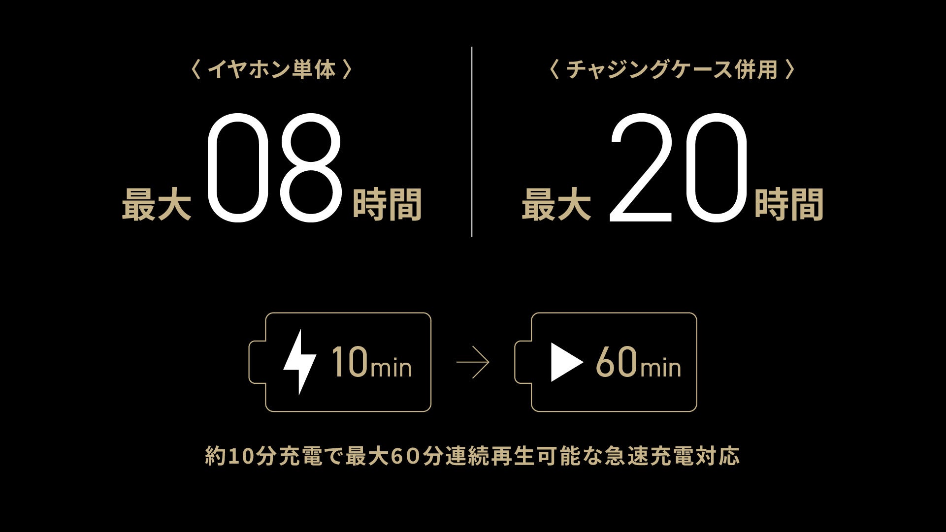 イヤホン単体で最大8時間*3、チャージングケース併用で最大20時間*3の長時間再生が可能。バッテリーを気にせずお使いいただける、安心のロングライフバッテリーです。