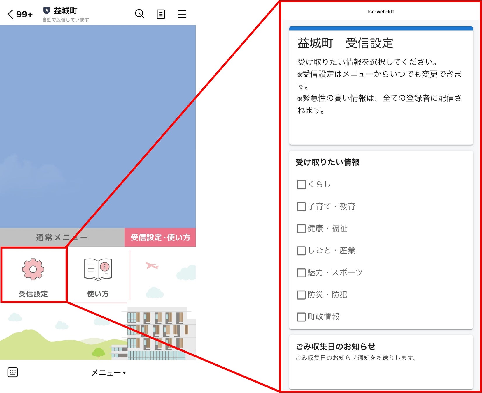 住民の希望に応じた配信だけを届ける「セグメント配信」機能を導入。欲しい配信カテゴリーを「受信設定」に回答することでカスタマイズすることができます。住民がほしい情報に絞って配信ができるため、町からの情報発信がこれまで以上に効果的になることが期待されます。