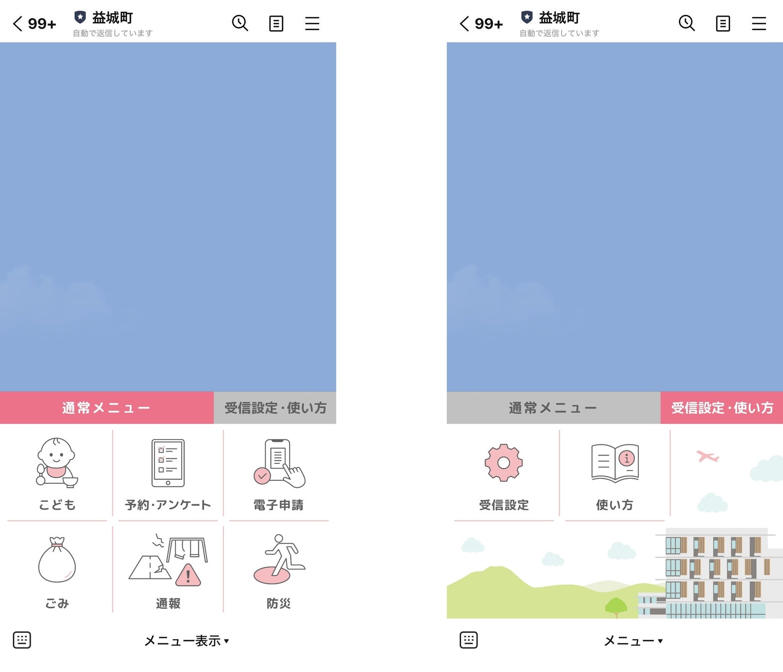 リッチメニューを切り替えることができる「タブ機能」を利用して、ジャンル別にメニューを表示させることができます。今回のリニューアルでは「子育て」や「オンライン申請」などのコンテンツに、チャットボット機能が導入されました。